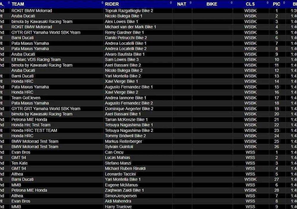 Tredicesimo e quattordicesimo posto nella classifica dei tempi per due ex MotoGP: Augusto Fernandez e Andrea Iannone. Lo spagnolo della Yamaha sta ancora prendendo le misure alla sua R1Il suo distacco dalla vetta è di quasi 1,8 secondi mentre quello dell’italiano del Team GoEleven è vicino ai due secondi. Disturbato dalle mutevoli condizioni della pista, il pilota di Vasto non ha montato gomme da tempo, e si è detto fiducioso per la settimana di gare.