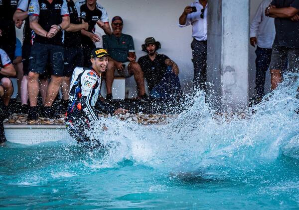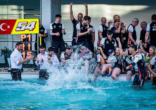 Una volta segnata la "tripletta portoghese" Toprak Razgatliuoglu si è lanciato nella piscina del Circuito. A festeggiare insieme a lui tutto il team!