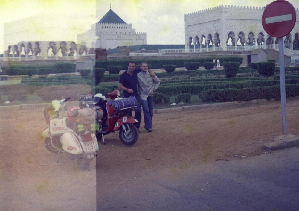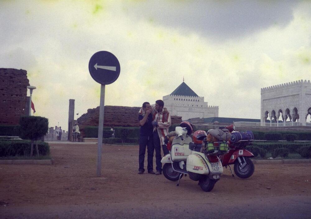 Alla vista dell’uomo cieco con il cappuccio scuro e gli occhi bianchi ingranai la prima e scappai… forse non ero il “duro” che credevo di essere! L’ambiente, che percepivamo, così differente dal nostro, cominciava a intimorirci ma ci adattammo e dormimmo in un alberghetto. Il giorno dopo partimmo da Larache, che la nostra guida definiva come “ridente cittadina” assistendo alla scena di un camion rovesciato con l’autista ferito e la gente che faceva sciacallaggio del carico. Continuammo per la strada costiera fino a Rabat. Al nostro arrivo in città fummo affiancati da un’Alfa Romeo Spider rossa targata Firenze con alla guida un cordialissimo individuo che ci chiamava dicendo “Bulagna, turtlen… ragazzi, siete arrivati fin qui in vespa? Accostate!”. Dopo due chiacchere sul ciglio della strada, l’uomo ci disse di seguirlo perché ci avrebbe portato in un hotel che conosceva. Lo facemmo fiduciosi: ci portò nell’ottimo albergo, ci accompagnò alla reception e ci raccomandò come ospiti dell’ambasciata italiana, il nostro “accompagnatore”, era infatti un diplomatico.