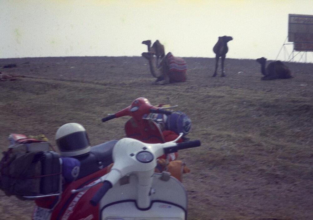 Ma dove andare? Pensammo subito all’Africa, meta ideale per un viaggio avventuroso. Andare in Africa, in Vespa sarebbe stato perfetto! Perciò ne ordinammo due, una P200E rossa per Gian Giacomo e una P150X bianca per me, Alessandro sarebbe stato caricato a turno. Passammo l’estate prima della partenza a fare chilometri girovagando qua e là con il solo scopo di completare il rodaggio per poter fare il primo tagliando. Preparammo le nostre Vespe sigillando parti del motore con silicone e organizzando lo spazio vicino alla ruota di scorta con pezzi di ricambio e medicinali. Comperammo le carte Michelin di Francia, Spagna, Marocco, Algeria e Tunisia. Questo era infatti l’itinerario stabilito: il giro del Mediterraneo occidentale. L’idea originaria era più ambiziosa: avremmo voluto compiere l’intero perimetro, ma scoprimmo che attraversare la Libia era praticamente impossibile. Allora non esistevano i GPS, i telefoni cellulari e internet; le foto si facevano su pellicola (avremmo dovuto averne tante in più!).