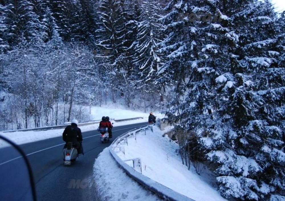 La giornata prosegue velocemente a commentare i motociclisti di tutti i tipi il più delle volte in sella alle loro moto autocostruite oppure su sidecar del periodo delle seconda guerra mondiale. A metà pomeriggio sotto una bella nevicata risaliti in sella alle Vespe ritorniamo a Riggerding per le seconda notte.