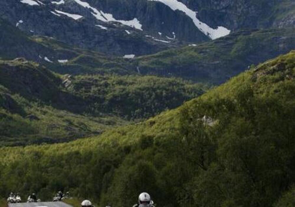 Lo spettacolo della natura, qui in Norvegia sovrasta tutto, e spesso mi ritrovo a pensare a quanto siamo indifesi nei suoi confronti, ma soprattutto a come facciano i suoi abitanti a trascorrerci interi inverni caratterizzati da intere (o quasi) giornate di buio! I paesi che incontriamo continuano ad essere semi deserti (o sono un popolo di vacanzieri o godono a stare chiusi in casa...) ma i pochi sopravvissuti, durante le soste, molto educatamente, chiedono lumi su chi siamo e perchè siamo lì con tutte quelle moto...oltretutto quasi tutte uguali. Quasi, perchè oltre alle Norge e Stelvio, c'é una V7 soprannominata "Alce", per via di un adesivo raffigurante il tipico animale scandinavo sul serbatoio, guidata eroicamente, lasciatemelo dire, da Irene... motociclista da pochi mesi ma che non teme nulla. Niente parabrezza, sospensioni marmoree, non propriamente una moto adatta a macinare centinaia di chilometri al giorno. ...ma a Irene, seppur minuta e carina, bisogna riconoscerlo, ha degli attributi da vichingo!