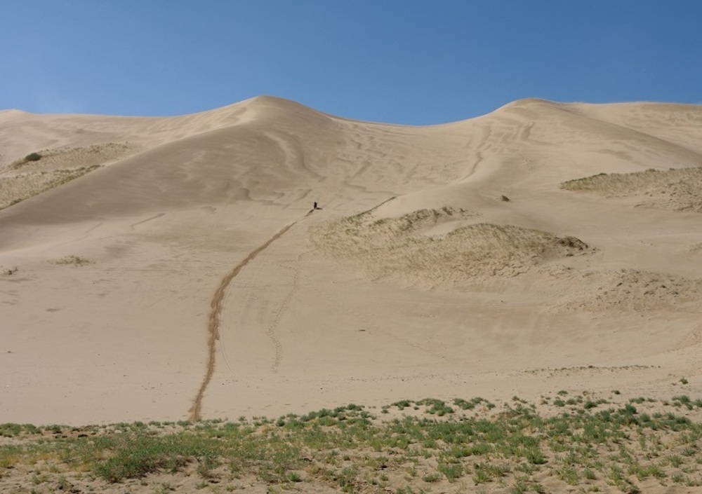 Si svalica dopo 270 km e per magia appaiono le dune del Gobi. Sembrano lì davanti, ed invece dobbiamo percorrere ancora 25 km prima di piazzare la tenda sotto le dune.