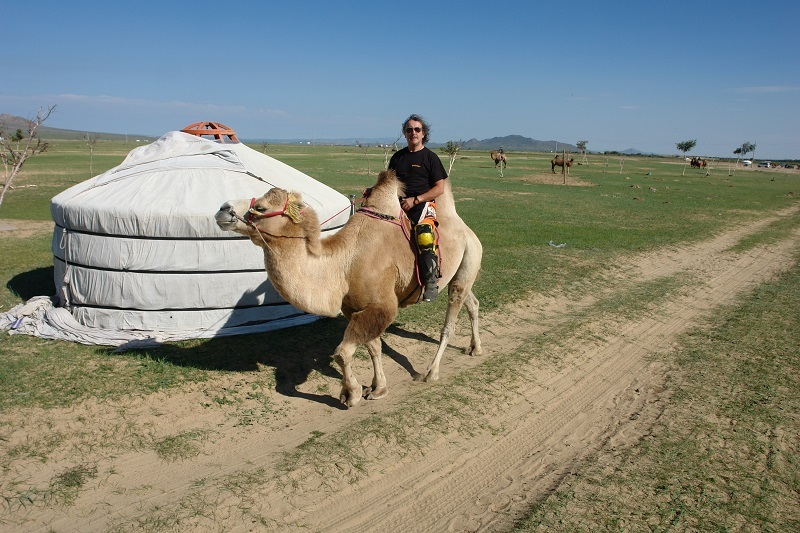 Più macino chilometri, più ritrovo la Mongolia che mi ricordavo: lunghi rettilinei circondati da un habitat incontaminato, gher, mandrie di cavalli e pascoli di ovini, a cui ora si sono aggiunti anche quelli di mucche; in cielo vedo le aquile simbolo di questo paese. Ora il clima è cambiato e fa capolino il sole. A Mandalgovi faccio rifornimento: altri 300 km e sono a destinazione, non prima di aver importunato dei cammelli che sornioni erano ai bordi della strada.