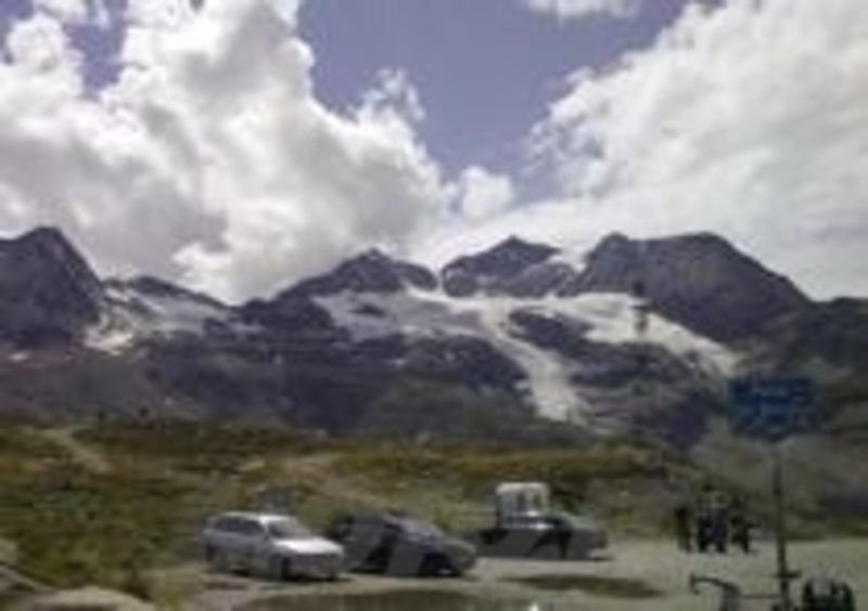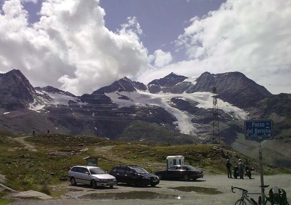Però mi piace, si respira un’aria serena e tranquilla e vedere che le persone preferiscono spostarsi con i mezzi pubblici piuttosto che con i mezzi propri da a questo paese quell’idea di ordine per la quale sono famosi gli Svizzeri, mi viene da pensare alle nostre grandi città come Milano o Roma dove invece si rischia di restare bloccati nel traffico dalla mattina alla sera. Dopo qualche chilometro anche qui la strada si fa in salita, l’asfalto è perfetto e c’è un po’ di traffico che non impedisce di osare un po’ di più sulle curve regalando sprizzi di puro divertimento, l’aria diventa fresca e poco dopo capisco il motivo quando davanti a me si presenta un ghiacciaio dalle notevoli dimensioni, cose del genere le avevo trovate solamente sui libri dell’università e poterle vedere dal vivo regala una grande emozione specialmente se di queste cose ne si capisce un po’: osservandolo si vede una lingua di ghiaccio scendere fino a valle e noto attorno a me pietre dagli spigoli vivi che indicano chiaramente essere depositi morenici. Questo ipotizza che il ghiacciaio potesse arrivare esattamente nel punto in cui mi trovassi in quel momento, il che mi fa pensare al fatto che siamo abituati a vedere la natura come ferma, quando in realtà essa è in continua evoluzione secondo tempi geologici che confrontati con la durata della nostra vita la rende paragonabile ad un battito di ciglia. Siamo sul passo del Bernina, a 2330 metri sul livello del mare, senza togliere il casco mi avvicino al cartello indicante il nome del passo per farmi scattare una fotografia, appoggiata vicino a me c’è una bicicletta da corsa appartenente a un ciclista che in quel momento sta facendo una pausa, mi dice divertito che in quel modo sembra che io sia arrivato in cima vestito da motociclista ma in bicicletta, e mi chiede se voglio fare scambio di mezzi.