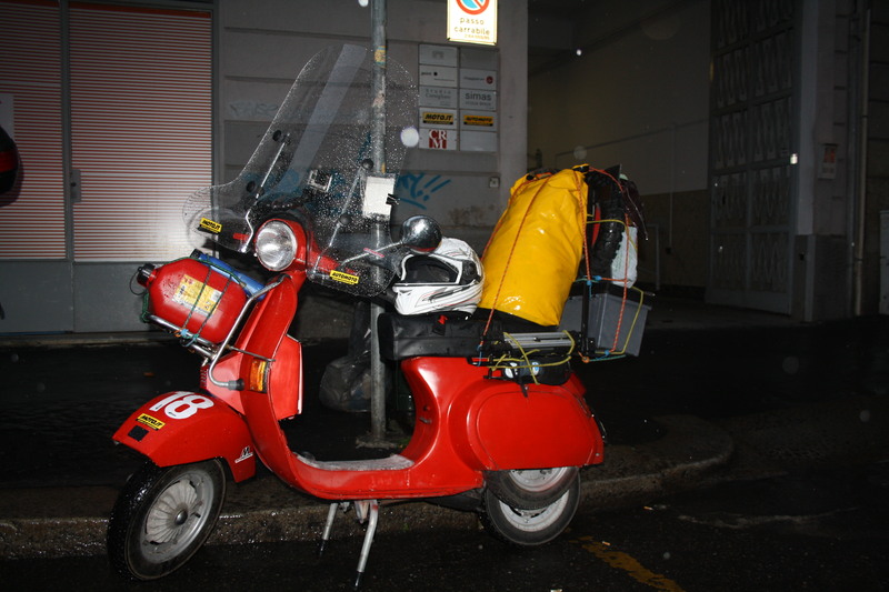 La Vespa è così: soprattutto quando è carica, quando si vede che è una Vespa da viaggio, suscita curiosità e simpatia. Mentre scarico tutto il bagaglio e lo risistemo, mi metto a parlare col barista e il benzinaio. Mi offrono il caffè e mi raccontano dei loro di viaggi in Vespa. Anni '70, in Spagna con gli amici, giovani vagabondi a due ruote in vacanza. Anche Internet non ha tardato a darmi la stessa sensazione di comunità: in pochi giorni la pagina Facebook Eurovespa ha già raccolto un bel numero di contatti e ho ricevuto un sacco di auguri, inviti, offerte di ospitalità: tutte voci che mi hanno dato entusiasmo e che mi fanno pensare a questo viaggio come a una lunghissima festa itinerante con tanti amici; così tanti che alla lunga anche le ore passate in sella, magari al freddo o sotto la pioggia incessante, sembreranno leggerissime. Certo, è arrivata anche qualche tirata d'orecchio, qualche “sei matto” meno scherzoso; effettivamente hanno ragione loro. Partire a novembre non è certo una scelta azzeccata; ma nel mio caso è una scelta obbligata. Davanti al bivio tra sfidare il freddo invernale e le strade in condizioni complicate o starmene a casa, non ho avuto alcun dubbio.