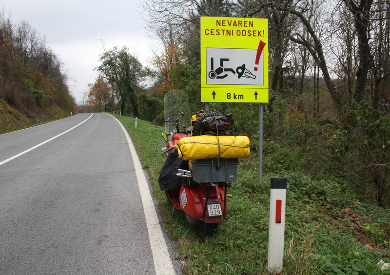 Lascio Lubiana un po' a malincuore, perchè è una bellissima città, ma le strade slovene mi consolano subito. L'idea iniziale era di andare verso Zagabria, ma mi hanno consigliato di andare verso sud per continuare a godermi il paesaggio e così faccio. Continua a piovere, ma ormai non ci faccio più caso. La strada è davvero bellissima e mi rendo già conto di come questo viaggio possa solo costruirsi così, strada facendo. È anche un viaggio fatto molto di più lungo la strada, negli incontri casuali con i benzinai o quando mi fermo a bere un caffè, piuttosto che nelle città o nei paesi dove mi fermo. Anche se, pure lì, gli incontri non mancano. Spesso non faccio in tempo a mettere Peyton sul cavalletto e a sfilarmi il casco che sento già qualcuno che mi chiama: “Ehi, man! Where are you from? With this? You're crazy!”.