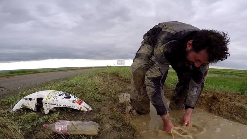 Questa decisione e il ritardo con cui mi sono reso conto delle circostanze provocano lo stallonamento del copertone dal cerchio, così a 80 km/h perdo completamente il controllo della moto e mi schianto a terra violentemente, rotolando qualche metro sulla banchina. I primi a soccorrermi sono sbalorditi, ma in silenzio ritorno alla moto e la guardo perplesso, conscio di aver avuto questo imprevisto in un momento in cui non ero concentrato sulla strada. Le repentine e pessime decisioni che ho preso negli istanti fondamentali della foratura hanno causato questa caduta: la moto ha le leve destre piegate, sia pedalina che freno, paramani rotto, telaio borsa laterale spezzato e una delle borse d’alluminio palesemente smussate dalla caduta.