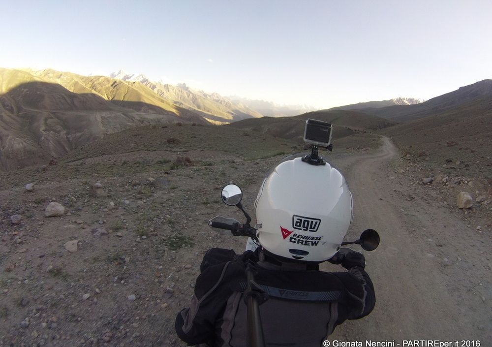 Quello che provo ad ogni chilometro e ogni giorno è il tanto anelato senso di meraviglia che ogni motoviaggiatore va cercando durante le lunghe traversate cui si sottopone in sella al proprio mezzo.E’ come se, all’improvviso, tutti i km tediosi e monotoni accumulati negli ultimi due mesi di viaggio venissero spazzati via da questi 1.500 km sterrati. Ognuno di noi ha una propria classifica dei posti e delle strade più belle che ha percorso in moto. Luoghi unici che hanno dato un senso alle centinaia di migliaia di km che abbiamo percorso per trovarli. Per me la Carretera Austral in Cile, la Ruta40 in Argentina, l’Altipiano in Bolivia e Perù e l’Indonesia sono i luoghi che più meritano di stare in quella classifica personale, ma da questo momento anche il Pamir e il Wakhan Valley ne fanno parte.