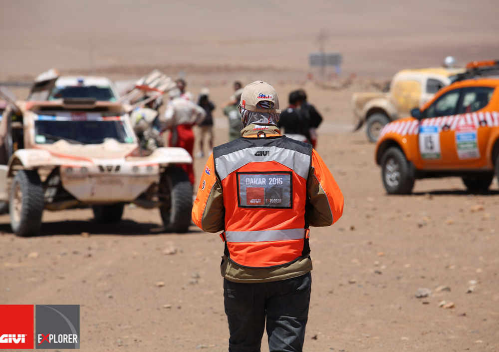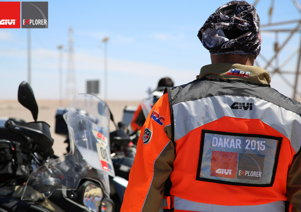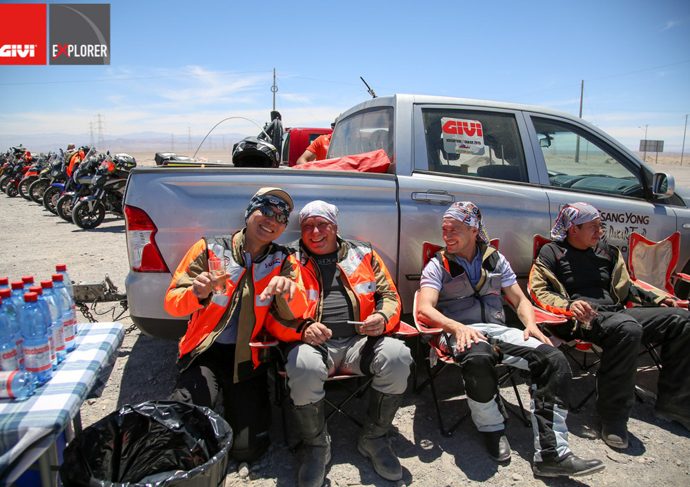 Un giro motociclistico fortemente emozionante, durato sette giorni, al quale hanno partecipato 11 ospiti. L’organizzazione ha previsto la presenza di una guida esperta in moto (Manuel, che ha partecipato a due Dakar) e due veicoli d’appoggio, che hanno fornito la logistica, raggiungendo i migliori posti di osservazione della gara, supportati da GPS e telefoni satellitari, e curato l’allestimento dei punti di ristoro che ogni giorno venivano approntati lungo il percorso. Tutte le moto (un mix di BMW, Honda, Kawasaki e Suzuki) sono state accessoriate con prodotti GIVI, a scopo test approfondito e sicuramente hard, utile a fornire feedback utili a introdurre miglioramenti futuri sulla produzione.