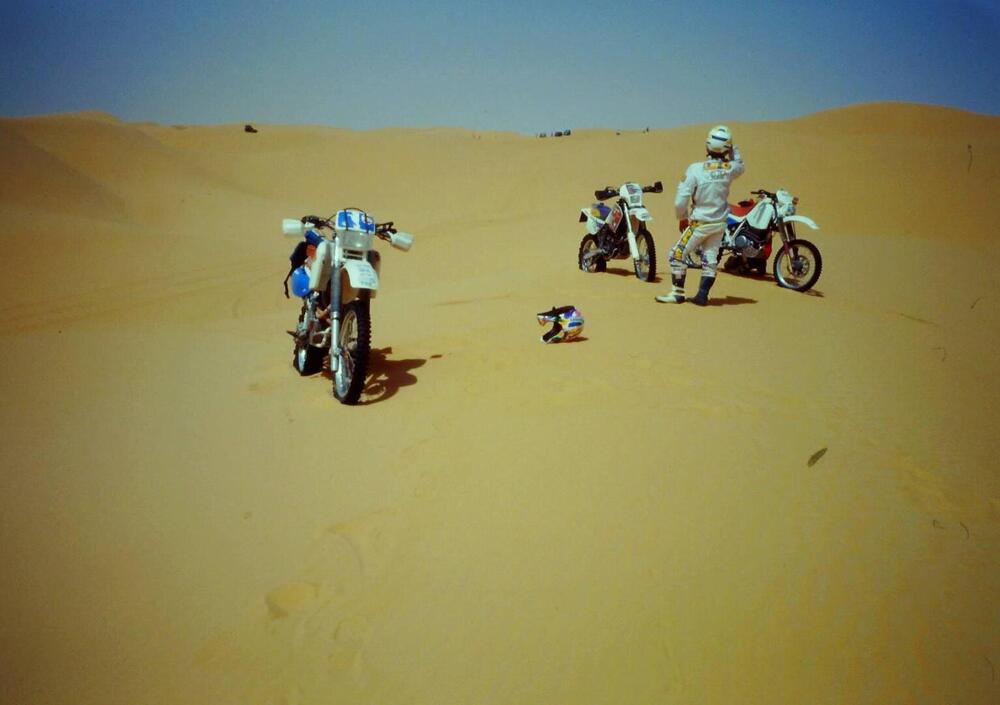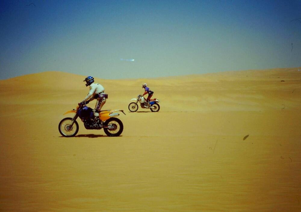 Le prime grandi dune suscitano qualche appetito. Eccone una veramente alta e Fabrizio è già in cima, il Secco lo segue, io pure. L’esuberante Andrea dr. calcola male una staccata e abbatte i due poveracci fermi sulla cresta della duna con le loro moto. Meno male che la sabbia è molle.