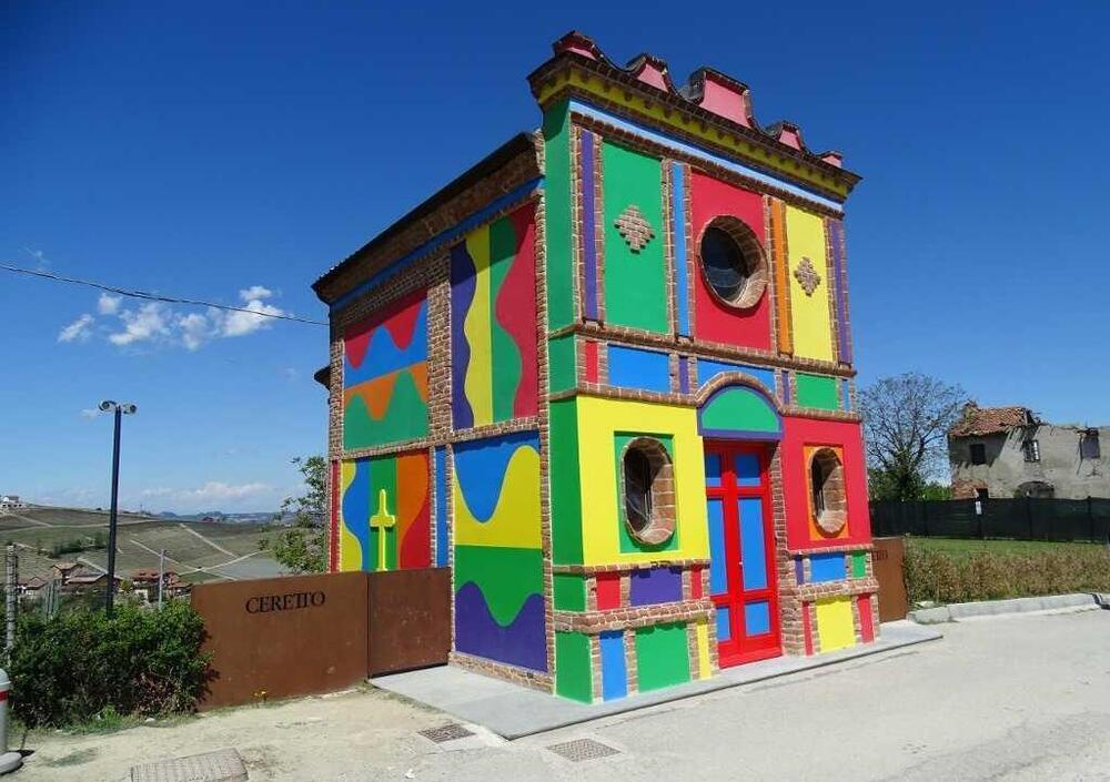 Raggiungo La Morra, invasa dai turisti del ponte, e scendo giù verso Barolo, in località Ceretto, fino a raggiungere la Cappella del Barolo dipinta dagli artisti David Tremlett e Sol Lewitt. Ecco il primo esempio di edificio recuperato dagli artisti stranieri che in questa zona hanno trovato il modo per esprimersi.