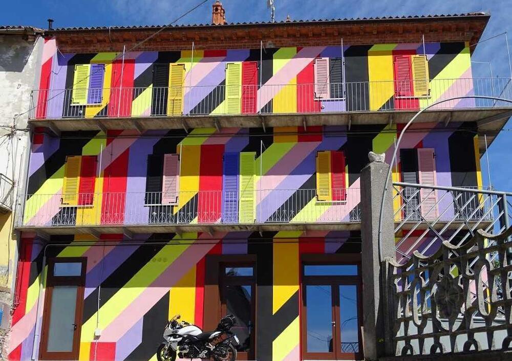 Roddino è molto meno conosciuto, il piccolo centro abitato ha recentemente inaugurato una casa dipinta sui tre lati da Lilian Gillick e Hito Steyerl e vuole rappresentare una vista dall’alto del territorio, con quelle geometrie di cui si parlava prima. L’opera è talmente recente e poco conosciuta che non c’è nessuno. In passato ospitava le scuole, oggi si trova uno studio medico, una biblioteca e una bottega dei servizi.