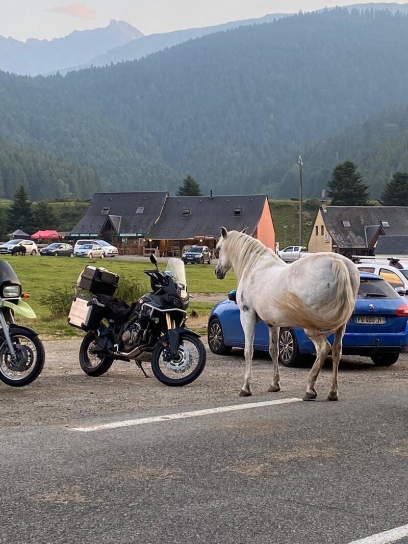 La Bergerie è anche il Pernod condito da animate chiacchiere. Noi constatiamo l’improbabile ma confortevole sistemazione che ci è stata riservata, ci rinfreschiamo con un’abbondante doccia e torniamo sull’Aspin: quattro chilometri agili (viaggiamo scarichi e con abiti civili) per gustare ottima carne alla brace, ascoltare il giornaliero aggiornamento sul love affaire di Gianni mentre alcune mucche pascolano in libertà nel vallone su cui si affaccia il ristorante. Questa atmosfera bucolica che ispira i racconti del nostro novello Peynet viene bruscamente interrotta dall’arrivo di pony e cavalli che si avvicinano, troppo per i gusti dei miei pard, alle moto: sono affascinati dalla sella pelosa che Gianni ha fortemente voluto, trovato e montato sulla sua moto. De gustibus non est disputandum, sostenevano Plutarco e, più tardi, Giulio Cesare. Fatto sta che lo stupore del cavallo era pari all’apprensione di Gianni per il destino della sella pelosa e conseguentemente della moto.