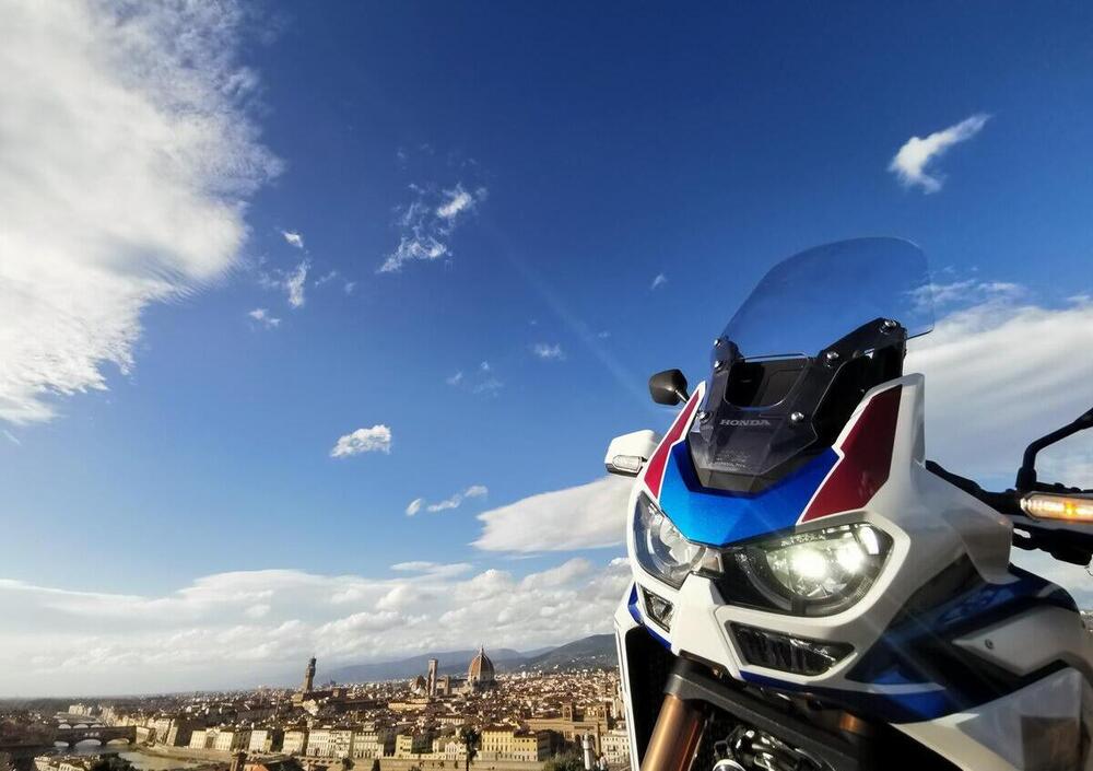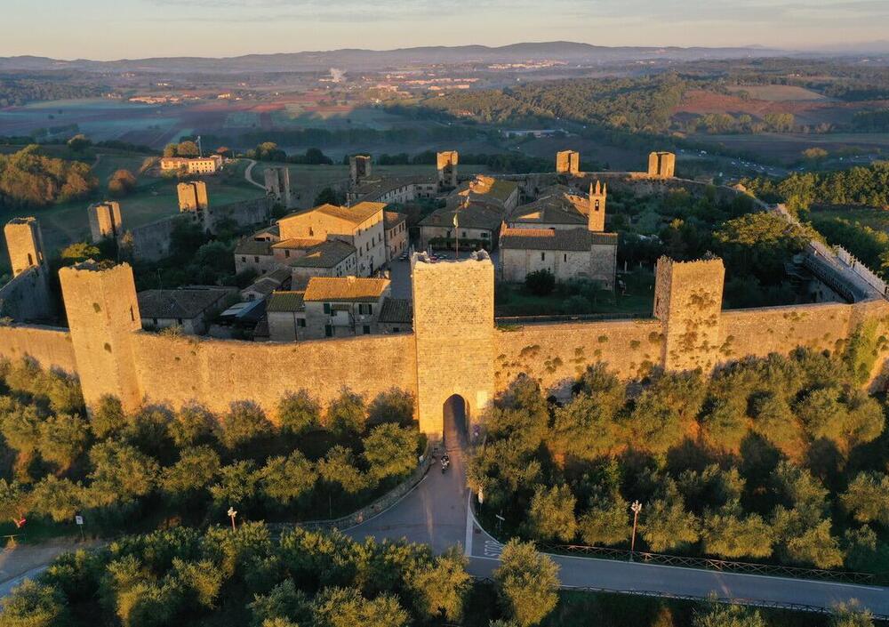 In sella alla nostra Africa Twin riprendiamo la Firenze-Siena da Poggibonsi ma, dopo una quindicina di chilometri, siamo nuovamente costretti ad uscire per un’altra sosta. Entriamo nel cuore di Monteriggioni, un borghetto medioevale fortificato, circondato da una murata di forma ellittica che sembra disegnato dalle mani di un artista. Invece è proprio così, autentico come la sua storia. Fu costruito in una manciata di anni dai senesi, dal 1214 al 1219, per uno scopo puramente difensivo, proprio per sorvegliare la via Francigena e le sue valli in direzione di Firenze, da sempre storica nemica di Siena.