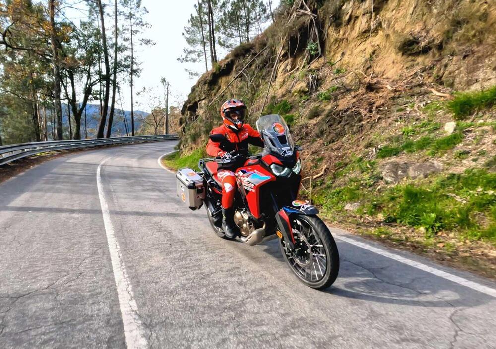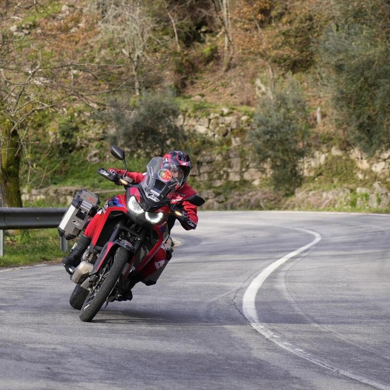 Attraversare queste valli è come perdersi attraverso una tavolozza di colori sui quali domina il verde intenso dei vigneti che dall’alto mostrano forme dolci e sinuose a dorso di tartaruga, e così perfettamente modellate da pensare come sia possibile che la mano dell’uomo arrivi a tanto. Continuiamo a scendere lungo la valle esaltandoci nella guida, l’Africa Twin non esita a scendere in piega in tutta sicurezza anche nei rapidi cambi di direzione, le sospensioni rispondono bene anche alle asperità che di tanto in tanto si incontrano, i freni anteriori hanno un’ottima risposta a patto di fare una decisa pressione sulla leva.
