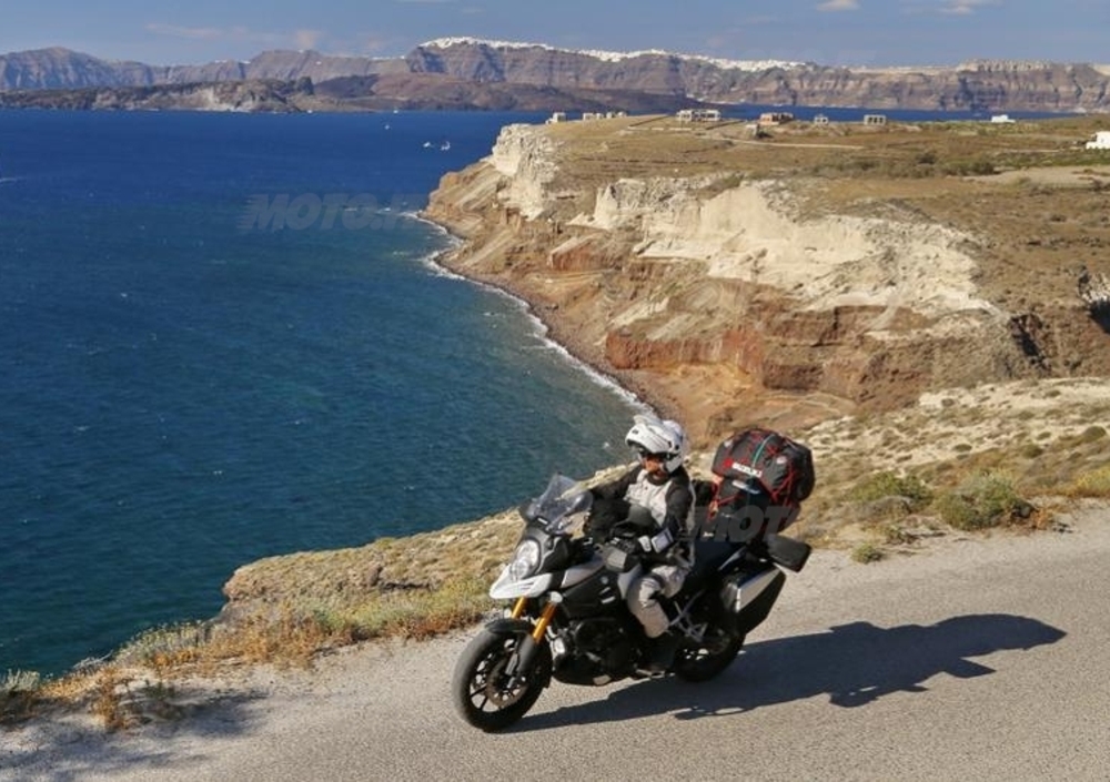 Mi racconta Danilo, il mio cameramen e compagno di viaggio e che visitò Santorini 27 anni fa, che allora si attraccava al vecchio molo e non essendoci altre vie di comunicazione, l’asino era l’unico modo per giungere in paese. Oggi le cose sono cambiate un po’, gli asinelli ci sono ancora ma per fare l’escursione turistica, in compenso si sono aggiunte strade e soprattutto un’infinità di auto, moto, ma soprattutto quad e autobus. L’architettura di Santorini è qualcosa di speciale, con gli intonaci delle case bianchissimi e levigati come vere e proprie sculture. Pur essendo un’isola dalle dimensioni piuttosto modeste visto che è lunga appena 28 chilometri, riusciamo a muoversi con assoluta disinvoltura, solo qualche lieve difficoltà magari l’abbiamo trovata nella serie di tornanti più stretti e ripidissimi dove la V-Strom, ben più carica degli asinelli, faticava un po’ ad inserirsi e a mantenere la traiettoria. Ma è la grande elasticità del motore, carico di coppia anche ai bassi, a disimpegnarci brillantemente da ogni situazione. Se un rapido trasferimento al sud dell’isola vale la pena giusto per vedere le rare spiagge, immancabilmente nere come il magma vulcanico dal quale derivano, la vera essenza di Santorini si vive indiscutibilmente nelle due località di maggiori richiamo, quelle in cui purtroppo, ma a ragione, si riversano decine di migliaia di turisti, tanto che se in inverno Santorini conta 15.000 abitanti o poco meno, in piena estate, ed in un solo giorno, può arrivare fino a 200.000!