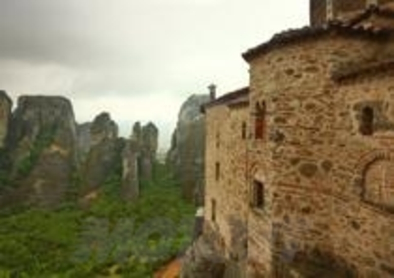 E noi che pensavano che la Grecia a giugno sarebbe stata una scelta ideale per prendere sole ed avere un’ottima luce, invece ci ritroviamo a prendere freddo e vento e, come se non bastasse, anche tanta acqua! Il punto di arrivo è Kalampaka, una movimentata cittadina che sorge ai piedi di una delle più grandi bellezze naturali, ma anche storico-religiose della Grecia: le Meteore. E’ affascinante pensare che un tempo, diciamo all’incirca 10 milioni di anni fa, le rupi e i pinnacoli delle meteore erano i depositi sedimentari di un mare interno che poi, in seguito ai movimenti tettonici, spinsero l’intera regione fuori dal mare stesso. Dichiarate patrimonio mondiale dell’Umanità, le Meteore sono dei monasteri arroccati su pinnacoli di roccia. Il toponimo meteora deriva infatti dall’aggettivo greco meteoros che significa “sospeso nell’aria”. Ma chi abitavano questi romitori così nascosti e isolati? I primi insediamenti dei monaci eremiti risalgono già all’XI secolo, ma fu nel 14esimo secolo, quando il potere dell’impero romano volgeva al declino e le incursioni turche erano sempre più frequenti, che alcuni religiosi si insediarono qui per cercare un luogo sicuro. La peculiarità che ha reso questi monasteri un luogo sicuro, praticamente invalicabile, fu il fatto che si poteva accedervi solamente attraverso scale rimovibili, poi in seguito furono introdotte degli argani con tanto di reti nelle quali i monaci vi si calavano dentro. Si narra che quando i visitatori incuriositi chiedevano con quanta frequenza si sostituissero le funi la risposta era: quando il Signore lascia che si rompono!