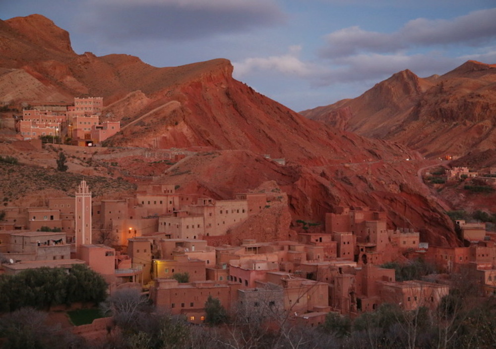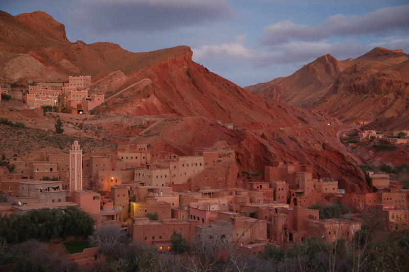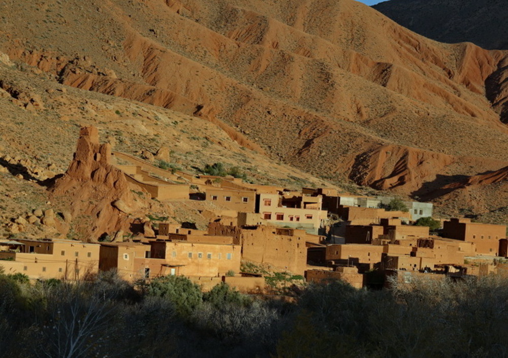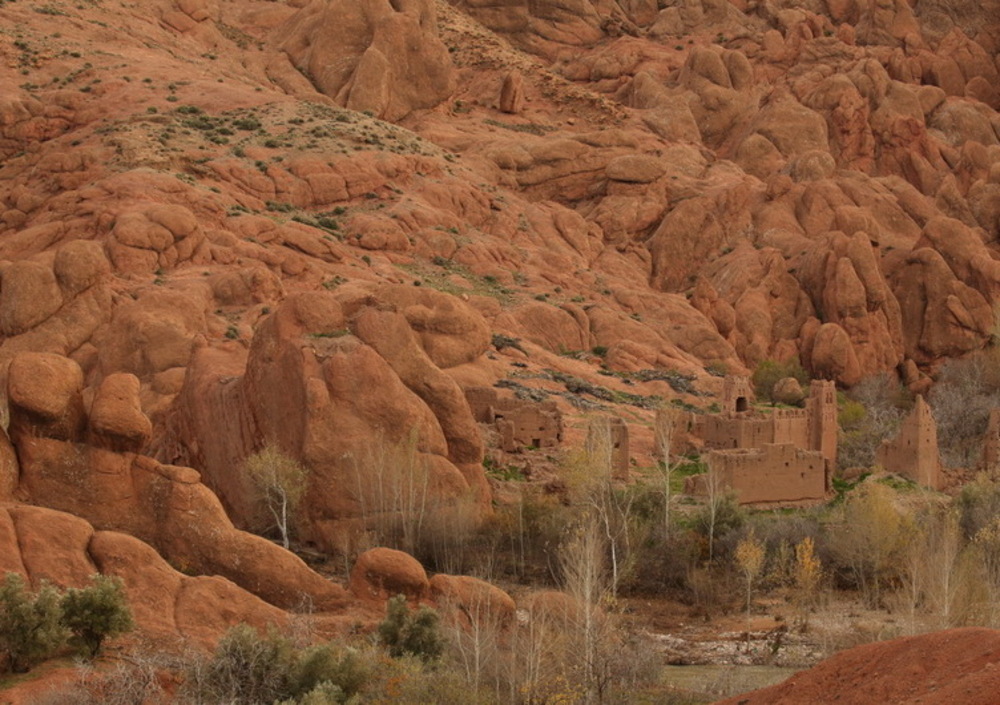 Tinghir è un paesotto che ha tutto e non ha niente. Si trova nel bel mezzo di due fra le più grandi meraviglie del Marocco, per cui diciamo che è un ottimo punto di raccordo, un crocevia dal quale è obbligatorio passare. O farci una sosta, anzi due, come nel nostro caso, giusto per trascorrerci la notte. La meta prescelta per la tappa di oggi è una delle gole più suggestive che si possono visitare in Marocco e non dista poi molto, un'ottantina di chilometri, di cui i primi cinquanta si percorrono lungo una strada velocissima, molto rettilinea, che in meno di mezz'ora ci porta a Boumalne Dades. Da qui inizia un percorso mozzafiato attraverso la valle di Dades o valle delle mille kasbah, che si presenta come un enorme blocco di calcare tagliato a fil di spada. In questo regno scosceso, racchiuso come petali di rosa, si nascondono una serie di kasbah straordinariamente belle quanto autentiche che si amalgamano perfettamente al colore ruggine, talvolta rossastro delle rocce. Il Dades scorre nell'Alto Atlante per circa 200 chilometri e nel suo corso attraversa quattro serie di gole con altezze che variano dai 200 ai 500 metri formatisi già 600 milioni di anni fa, una. Inoltrandoci all'interno della Valle del Dadès arrivando in breve nel paese di El-Kelâa M'Gouna, il principale centro di produzione di acqua di rose e di tutti gli altri preparati realizzati con le foglie della pianta. La raccolta dei fiori avviene nel mese di maggio ed è questa una delle più antiche tradizioni di questa regione.