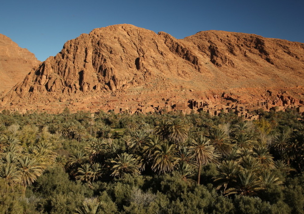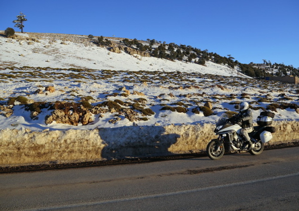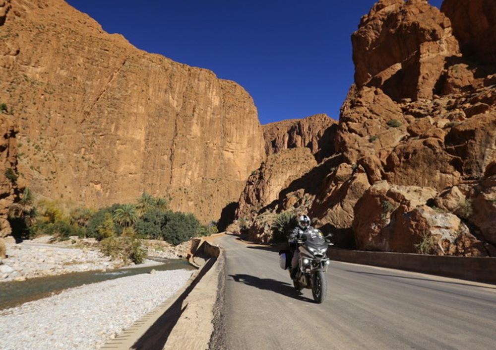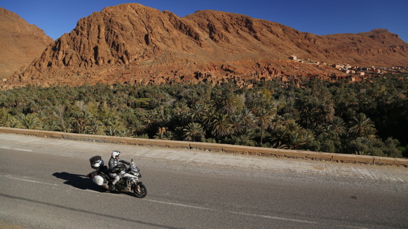 La valle del Todra, prima di giungere nella parte finale delle gole, è un percorso ricoperto di fitte palmeraie e di villaggi berberi. Kasbahs e ksour abbandonati fanno parte della storia e della tradizione e, seppure nuovi villaggi sorgano un po' ovunque senza seguire un preciso ordine architettonico, quanto meno l'autenticità del villaggio viene mantenuta anche se non preservata. Avremmo voluto trascorrere molto più tempo in questa regione ma abbiamo da percorrere ancora 430 chilometri prima di arrivare a destinazione entro la sera. Imbocchiamo così la N8, sempre facendo attenzione alla "gendarmerie royale" che piantona l'ingresso e l'uscita di ogni città impugnando, già che ci sono, anche l'autovelox con pistola laser. Tutto possiamo dire del Marocco ma non certamente che siano carenti nella viabilità. Le strade sono perfette, scorrevolissime e ben curate. Con la nostra Crossrunner facciamo fatica a rispettare i limiti anzi, non li rispettiamo affatto consapevoli di prende una serie di multe a catena, ma del resto il rischio effettivo non esiste nemmeno a tenere un passo di 160 orari su una strada extra-urbana. Il tasso di vibrazioni della VFR è piuttosto contenuto ma ciò che rende piacevole la guida è l'ergonomia della moto stessa, con manubrio da enduro stradale e l'accoppiata sella/pedane ben posizionata.