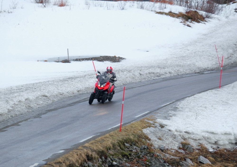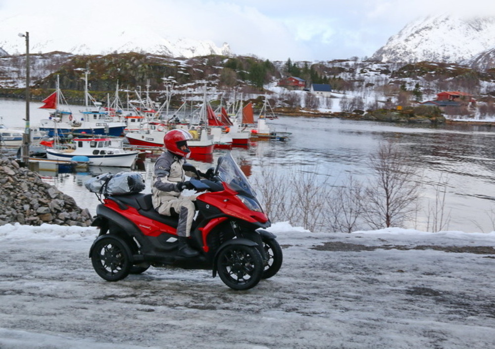 Le isole Lofoten sono un piccolo arcipelago situato al nord del circolo polare artico, tremendamente belle per quella loro conformazione orografica fatta di montagne appuntite che si tuffano a picco sul mare, fiordi, ghiacciai e cascate. Se in estate sono affascinanti per quel verde intenso che le colora, in inverno sono ammantate in quel bianco candido che sembra quasi proiettarle in una dimensione surreale. Il nostro Quadro4 procede silenzioso ma senza indugio, l'asfalto delle Lofoten nel mese di marzo è un po' a rischio per i rapidi passaggi da asciutto a bagnato e da innevato a ghiacciato. E naturalmente senza troppo preavviso. Le quattro ruote innalzano sicuramente il fattore sicurezza, anzi diciamo pure che un viaggio del genere sarebbe stato impossibile con qualsiasi altro mezzo, tanto è vero che siamo in assoluto gli unici motociclisti in giro.