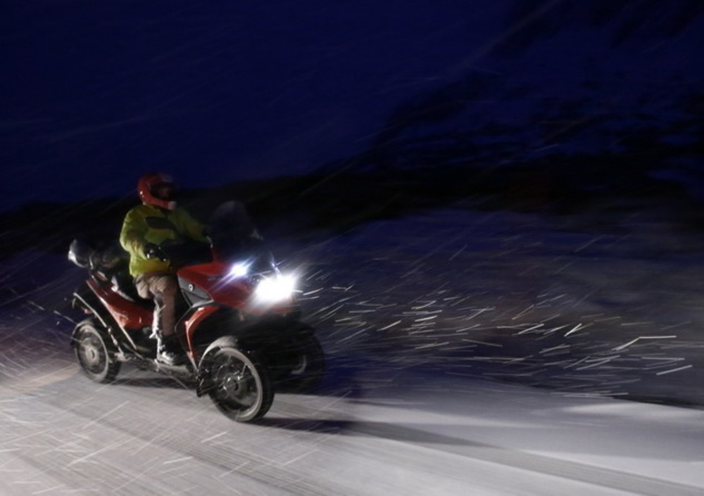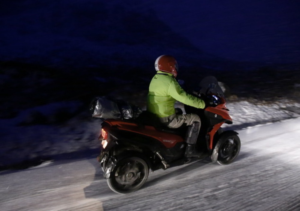 La chiusura di viaggio della sera scorsa non è stata delle più brillanti e Dio solo sa quanto sia stato impegnativo rimanere in piedi in mezzo ad una bufera di neve accompagnata da raffiche di vento trasversali. Eppure viaggiare appoggiati su quattro ruote, seppure con interasse e carreggiata ridotti, dà i suoi indiscutibili vantaggi, fosse solo per le tante soste brevi di un viaggio cittadino dove il Quadro4 resta praticamente in piedi senza gravare minimamente sull'appoggio della gamba. Certo che le menti svizzero-italiane che lo hanno brevettato debbono avere avuto una grande fantasia in primis e poi si sono certamente distinti applicando la tecnologia ad un grande ingegno. Si chiama HTS (hydraulic tilting system ed è in pratica un sistema di sospensioni pendolanti in grado di far lavorare indipendentemente le ruote del mezzo portandolo ad un'inclinazione di ben 45°! L'assetto, una volta vinta la spinta inerziale, si mantiene assolutamente neutro e la stabilità dell'avantreno si apprezza anche sulle curve veloci e con fondo sconnesso.