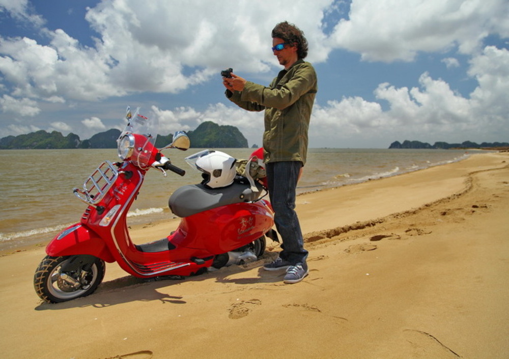 Per visitare una delle baie più belle e famose al mondo, ovviamente patrimonio Unesco, la nostra Vespa non ci è purtroppo utile anzi, siamo costretti a dovercene separare, ma non prima di aver esplorato l'aera adiacente di Tuan Chau Island, una zona fortemente turistica ed in pieno sviluppo anche a livello di strutture ricettive. Siamo consapevoli di non avere una Guzzi Stelvio alle mani, ma anche con una "vespina" da 130 chili e 11 cavalli si può sempre tentare un pizzico di avventura se giustamente motivati. E' l'ultimo lembo di sabbia non ancora conquistato dalle imprese costruttrici a sedurci, scendiamo a riva con la nostra Primavera che riesce per un tratto a veleggiare sul bagno-asciuga, finché non molliamo il gas. Sono quei momenti di silenzio e solitudine a dare un senso ad un improvvisato fuori-porta.