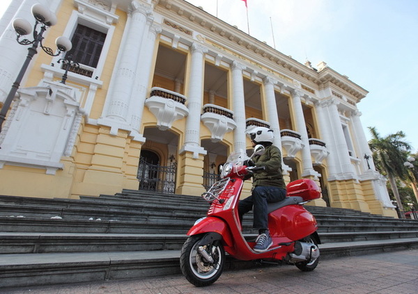 Il nostro viaggio parte proprio da Vinh Phuc, dalla sede Piaggio, balzando in sella ad una Primavera appena fresca di giornata! Il primo trasferimento non è certo impegnativo a livello chilometrico, poco meno di un'ora per raggiungere il centro di Hanoi, ma lo è molto di più a livello mentale, di attenzione, visto che arrivare dall'Europa e catapultarsi su una Vespa nel traffico della capitale vietnamita non è un'impresa di poco conto! Oltre 6 milioni di abitanti vivono della sola Hanoi con un parco circolante, fra moto e scooter, di 4,5 milioni di veicoli a due ruote. Che si sparpagliano in mezzo alle strade come uno nugolo di formiche rosse in preda ad una scarica di DDT! E con l'aggiunta di uno strombettio continuo di clacson che ti fa perdere subito l'orientamento. Semmai uno l'avesse trovato...