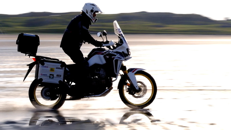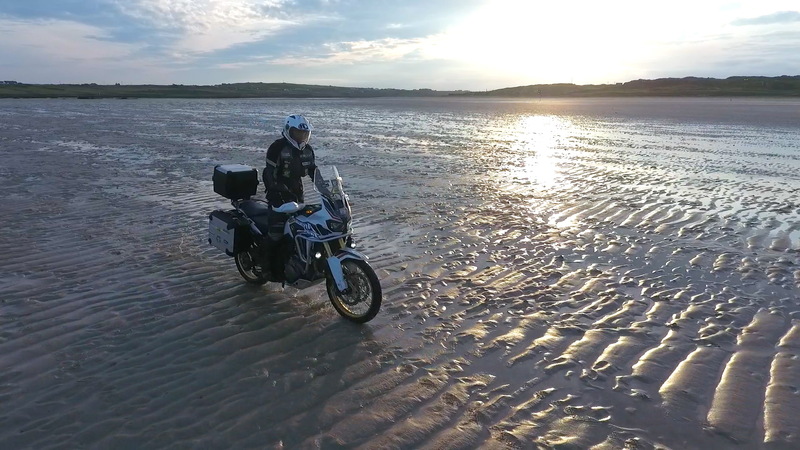 Quello che ci frega però, ma che al tempo stesso darà un senso compiuto alla nostra giornata, è un semplice cartello che indica “Omey Island” a 2 km: e che noi, curiosi per natura, non potevamo far altro che toccare con mano! Il tempo di arrivare per capire la straordinaria bellezza di questa spiaggia, che potrebbe essere un perfetto set cinematografico per un film di Bond o per una puntata di Top Gear. Immaginate uno spiaggione immenso che si estende in ogni direzione, con la sabbia striata a gobba di tartaruga e immersa in una specie di bagnasciuga. La situazione perfetta, quasi surreale, per ogni fuoristradista! Omey island è una cosiddetta isola tidale, ovvero un’isola che con la bassa marea diventa penisola, per cui resta unita alla terraferma: una specie di Mont Saint Michel, insomma, ma molto più selvaggio. Nei momenti di bassa marea lo spettacolo di questo deserto circondato dalle acque è assoluto, e posso garantirvi che percorrerlo in moto è una sensazione che non ha prezzo! Anzi, fosse solo per questa esperienza, l’Irlanda val bene un viaggio! Controllo di trazione disinserito, e gas a manetta! L’Africa Twin, nonostante i pneumatici stradali, veleggia su questa infinita distesa dorata; e i colori di un tramonto che si riflettono sui ristagni di acqua ci fanno capire che stiamo vivendo, sicuramente, il momento più straordinario di questo viaggio…