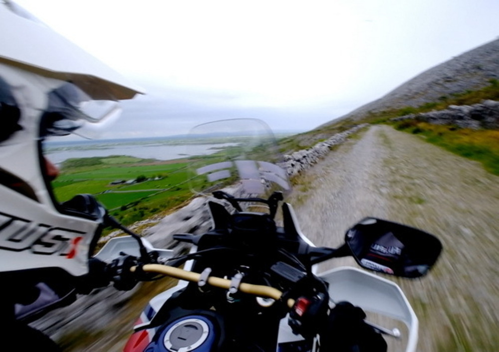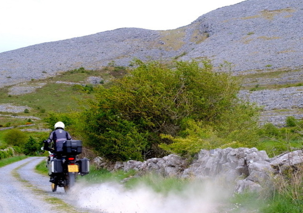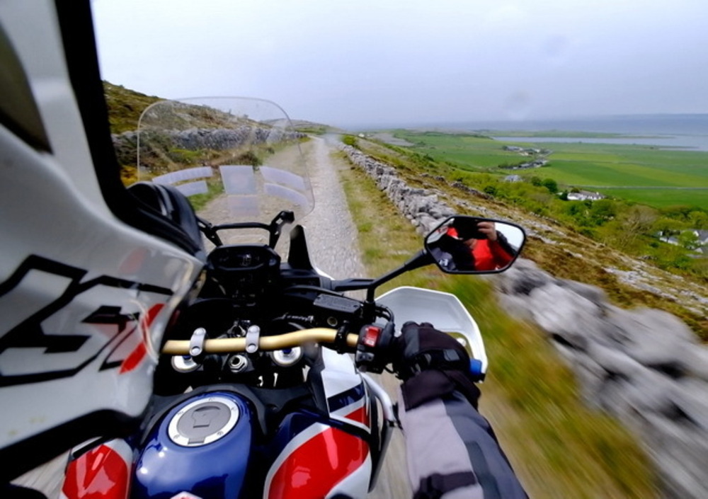 Posizionando la sella in modalità “low” l’Africa Twin è gestibile in quasi ogni situazione anche grazie ad un baricentro relativamente basso, l’unico elemento che inevitabilmente si tocca, in certi passaggi, sono le valigie. La puntata di oggi è dedicata alla morfologia di questo territorio per cui, prendendo una diramazione della R380 ci fermiamo ad Aillwee, una delle grotte carsiche del Burren formatasi per effetto dello scioglimento delle acque glaciali che, erodendo il terreno, hanno scavato un fiume sotterraneo. Ad onor del vero non sono poi così straordinarie come ci vogliono far credere le guide; stalattiti e stalagmiti sono rare e le vere concrezioni, quelle quantomeno visibili, scarseggiano. Proseguiamo la nostra marcia per visitare un altro sito, Poulnabrone, situato all’interno di un plateau di calcare carsico a 150 metri sopra il livello del mare. E’ qui, in questo mare di pietra, che i geologi hanno ritrovato tombe risalenti a 5.000 anni fa con i resti di ben 30 famiglie.