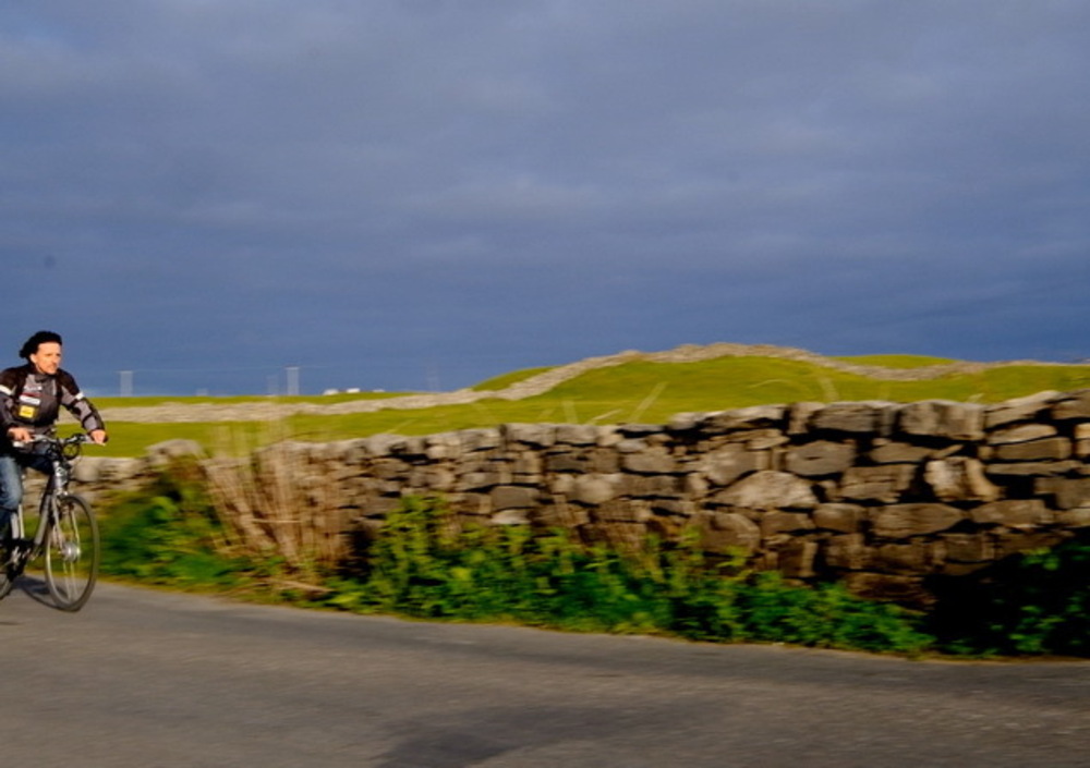 E per due ragioni. La prima che andremo in un luogo davvero spettacolare e per di più poco conosciuto, la seconda è che saremo costretti a mollare il nostro mezzo. Sì, perché dal porto di Doolin non sono previsti servizi di traghetto né per auto né per moto, diretti alle isole Aran, la nostra prossima meta. Pur avendo visto personalmente una buona parte di mondo nei 138 paesi che ho visitato in 30 anni di viaggi, raramente sono rimasto colpito da una bellezza così straordinaria e naturale sprigionata da madre Terra. Pur essendo distanti solamente 9 miglia dalla costa ovest dell’Irlanda, sembrano veramente appartenere ad un altro mondo o meglio, ad un’altra epoca. Sono tre le isole che compongono l’arcipelago delle Aran: Inis Oirr, Inis Meàin e Inis Mòr e, sommando tutti gli abitanti, non arriviamo nemmeno a fare 1.300 anime! Qui si conservano le vere tradizioni dell’Irlanda a cominciare dalla lingua ufficiale, il gaelico, insegnato nelle scuole e parlato rigorosamente da tutti. Per conservare in maniera intelligente il territorio poi basta non dare modo ai turisti di disporre delle loro comodità, per cui una volta sbarcati sull’isola l’unico mezzo di locomozione, a parte muoversi a piedi o in bus, resta la bici. In due escursioni, fra pomeriggio e mattino, ci spariamo 35 chilometri ed almeno decina a piedi, cercando di non rimpiangere la nostra Africa Twin che è rimasta a Doolin.