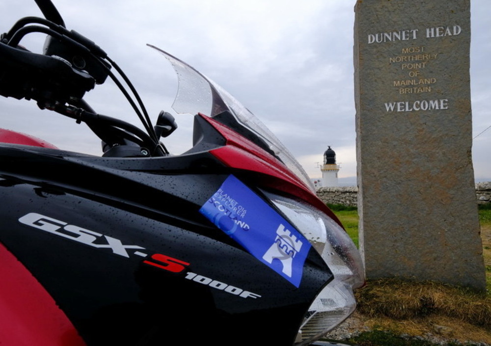 Noi invece saltiamo in sella alla GSX S1000F che ci sembra ben più concreta e con la quale instauriamo davvero un bel feeling che cresce con l’aumentare dei chilometri percorsi. Eppure gli smanettoni tedeschi hanno proprio ragione a montare i manubri larghi sulle loro ipersportive, alla fine ti ritrovi una moto versatile e che non ti stanca affatto, ma che sprigiona tutta la grinta ed il carattere racing quando spalanchi il gas. E dopo giornate fatte di 300 km. e 12 ore comprese foto e riprese, posso garantirvi che scendo di sella con lo stesso mood che ho quando mi alzo dal divano di casa. Strano a credersi ma è così. Per raggiungere l’estremo nord della Scozia ci sono più strade ma noi, per completare il tour della Scozia in senso antiorario, scegliamo la A99 che da Inverness ci porta dritti a Wick, dove la desolazione delle case e dell’architettura in genere è esattamente proporzionale al meteo e al colore del cielo. Giusto il tempo per un rifornimento, più rapido possibile, e percorriamo gli ultimi chilometri per giungere a John O’ Groats considerato fin dal 400, il punto più settentrionale della Scozia. Ma ad onor del vero il primato spetta a Dunnet Head, una desolata scogliera ma così affascinante da perdercisi dentro, lanciando lo sguardo verso l’orizzonte, sempre più a nord, dove le isole Orcadi ci mostrano il loro esile profilo.