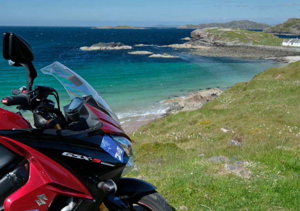 Usciti dal porto, al primo incrocio giriamo sulla destra, in direzione Durness, proseguendo il nostro tour della Scozia sempre in maniera anti-oraria, verso ovest. Avevano ragione in molti a dire che il lato più bello di questa nazione fosse quello occidentale, e non vi è assolutamente dubbio che sia proprio così. Il paesaggio cambia radicalmente, quasi una metamorfosi da un punto di vista orografico. Scopriamo dei tratti costieri meravigliosi, fatti di finissime spiagge bianche e orlati da scogliere, mentre lungostrada è il giallo delle ginestre in piena fioritura che spesso ne disegna il percorso. A tutti gli amici di Moto.it che dovessero capitare in questa parte della Scozia, soprattutto in moto, consigliamo vivamente una piccola deviazione sul percorso della A894 e da Kyleskyu, invece di proseguire a sud, sarà bene imboccare la B869, che passando da Drumbeg vi farà scoprire un angolo di terra insolito. Impervio, remoto ma anche romantico, un po’ come lo sono le highland scozzesi che probabilmente in questo punto poco battuto dal turismo, ma puntellato da villaggi di pescatori, ci mostrano intatta la loro seducente bellezza. Il tratto di strada si snoda lungo un percorso semi-ovale di una 50ina di chilometri circa, fatto di curve e saliscendi, dove il gusto di guidare una moto sale alle stelle! Cambio e frizione lavorano piacevolmente e senza sosta, e forse è proprio il cambio uno dei punti di forza della GSX-S1000F, fluido e rapido negli innesti, accompagnato da una frizione che stacca ottimamente, senza mai accusare il minimo cenno di fading.