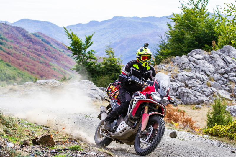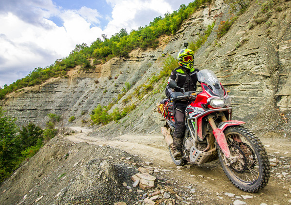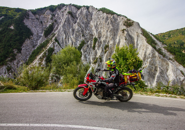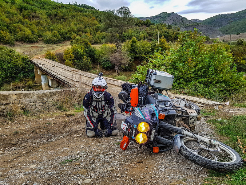 Effettivamente la prima parte è molto piacevole, siamo su una semplice strada bianca che costeggia un fiume, siamo convinti di aver fatto la scelta giusta, vista la bellezza di ciò che ci circonda: ma purtroppo l’Albania, da tanti considerato il paradiso dell’offroad, non è un Paese facile e le strade iniziano subito a diventare più impegnative. Le strade sterrate ci lasciano e iniziamo a salire su mulattiere pietrose che con i nostri pesanti bicilindrici non sono facili da percorrere; eppure siamo felici: questo Paese è veramente fantastico.