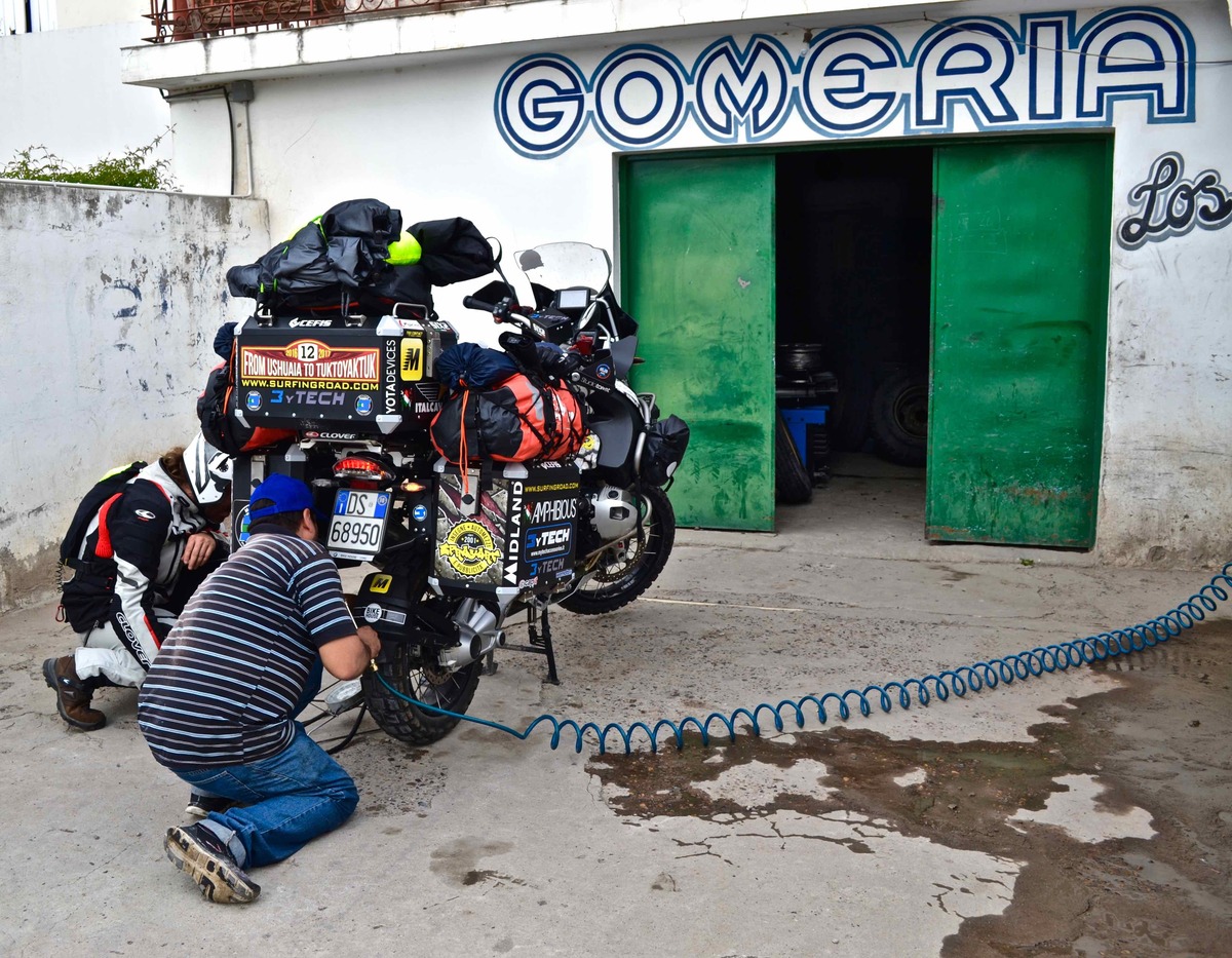 Il “ Ripio” riserva i suoi imprevisti… una riparazione provvisoria e dopo un buon check-up alle gomme.