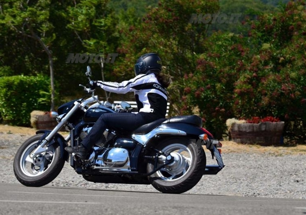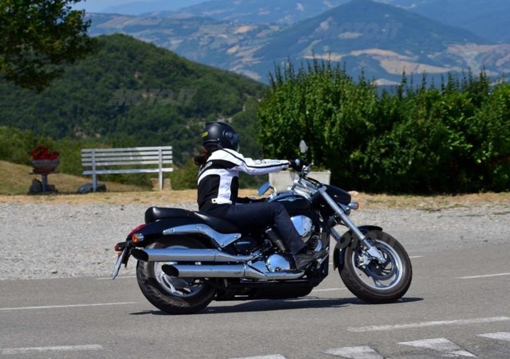 Tutto questo a favore della guida: cominciando a salire sulla Strada della Cisa, dove le curve si fanno più strette e si susseguono con ritmo più deciso, la piccola Intruder si arrampica disegnando le curve con la precisione di un compasso. Solo nelle salite più ripide o nelle riprese in caso di sorpasso, forse un po' di motore in più non avrebbe guastato. Gli 800 cc, spinti da 53 cv a 6.000 giri, si comportano comunque egregiamente vista la mole da spostare (circa 270 kg più guidatrice!). E per chi pensa che non siano abbastanza c'è la sorellona da 1.800 cc, simile nelle forme (ma non nelle dimensioni!) che vanta un brillante motorone da 125 cv.