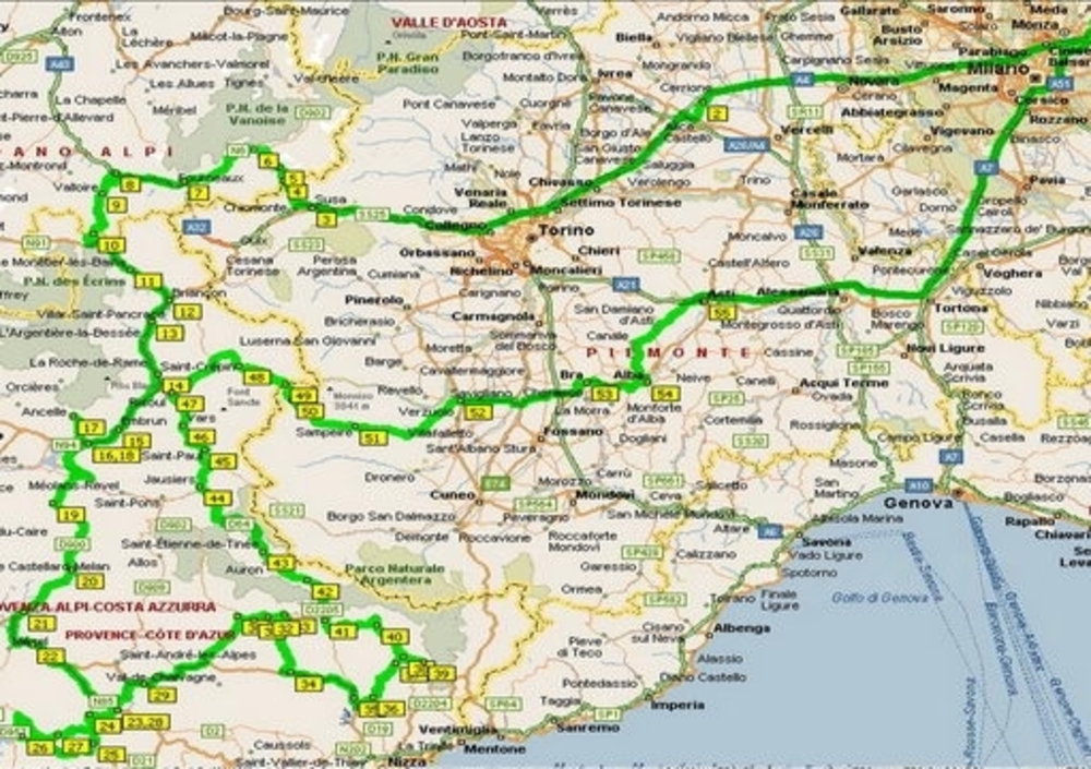 Principali località attraversate: Susa - Moncenisio - Modane - Galibier - Briancon - Embrun - Savines le Lac - Dignes les Bains - Castellane - Trigance - Aiguines - Verdon - Guillaumes - Gorges de Daluis - Valberg - Gorges du Cians - Beuil - Touet sur Var - Lantosque - Tourini - Jausiers - Vars - Guillestre - Agnello - Saluzzo - Alessandria.