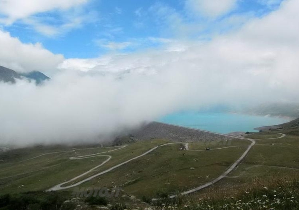 Primo giorno (km. 440): ritrovo a Carisio e dopo caffè, baci e abbracci partiamo alla volta di Susa dove ci attende la solita pioggia fantozziana, per cui ci fermiamo ad un distributore con tettoia dove ci mettiamo le tute da acqua. Per fortuna durante l’ascesa al Moncenisio smette di piovere e compare un po’ di sole: il panorama è bellissimo e la strada pure, il traffico è poco così ci possiamo godere appieno entrambi. Arrivati in cima ci attende uno spettacolo eccezionale: dalla parte francese c’è il sole mentre da quella italiana ci sono nuvole basse che coprono parzialmente il lago, ma contribuiscono a rendere più singolare la vista. Ci fermiamo il tempo di mangiare una gustosa baguette strapiena di roba e berci una birra (prezzo modico) e fare le numerose foto di rito.