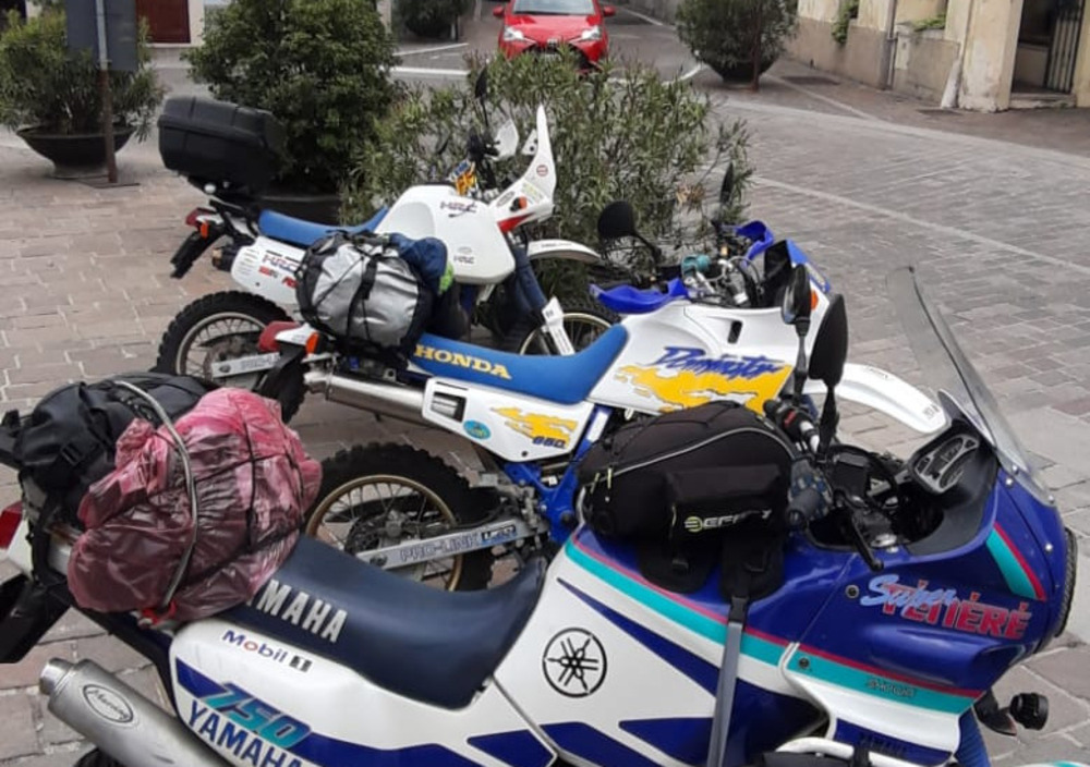 Con le loro moto di seguito descritte: Marco K. con Honda Dominator "dakarizzata" per l’enorme serbatoio montato e il doppio faro anteriore; Angelo C. anch’esso con Honda Dominator, ma nel suo caso restaurata in modo certosino, e Carlo G. con la Yamaha Super Tènèrè 750 che quotidianamente 365 giorni l’anno utilizza per recarsi al lavoro.