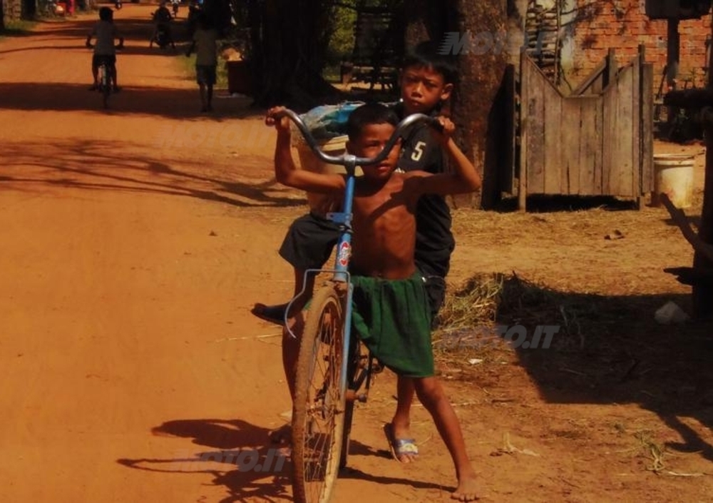 Potrei essere a pochi passi da una mina antiuomo. Forse la possibilità è zero virgola qualcosa ma per me è già abbastanza; ogni mese circa trenta sfortunati saltano su una mina, spero che per questo novembre si sia già raggiunto il numero. Spengo il motore dell’ XR, mi concentro e guardo il breve percorso appena compiuto, se fossi un bravo endurista potrei girare la moto di 180° facendo perno sul cavalletto laterale e tornerei indietro esattamente sulle orme dei miei tasselli, ma sono soltanto uno che a casa propria fa lo sborone con i 120 cavalli del suo bombardone e non un vero motociclista come i cambogiani. Se non sorridono tanto spesso, una ragione l’ho trovata. Se i loro bambini hanno un non so che di accusatorio quando cerco di giocarci, il motivo più superficiale credo di averlo intuito.