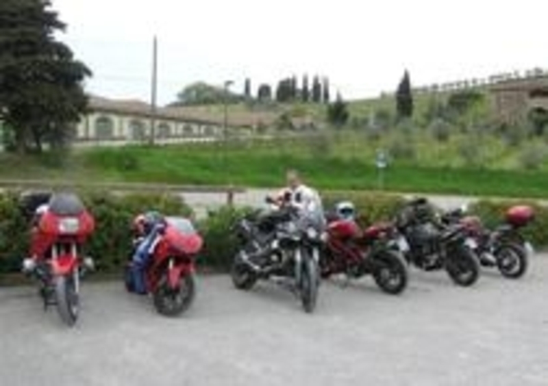 Così è iniziata l’idea di un fine settimana lungo tra chi scrive e Sergio, un caro amico di Roma (nessuno è perfetto, ehehehe), ma dopo pochi giorni si aggrega un collega, poi un suo amico, un mio amico subacqueo ed infine mio cugino. Trovato un appartamento adeguato in un agriturismo vicino a Castellina in Chianti, finalmente arriva il 25 aprile, giorno della partenza e con esso lo spirito di aggregazione che c’è tra noi motociclisti. Ritrovo a Legnano con il sottoscritto (Triumph Street Triple 675 R) e Dario (Ducati Streetfighter 848), si procede fino a Lainate per incontrare William (Guzzi Stelvio 1200) poi all’ingresso dell’autostrada troviamo Alfonso (BMW 75RS) e a Fornovo troviamo mio cugino Alberto (Ducati 1098) che fa da battistrada lungo il passo della Cisa stradale fino al rientro a Pontremoli e proseguimento in autostrada fino a Cecina dove raggiungiamo Sergio (Honda VFR 1200).