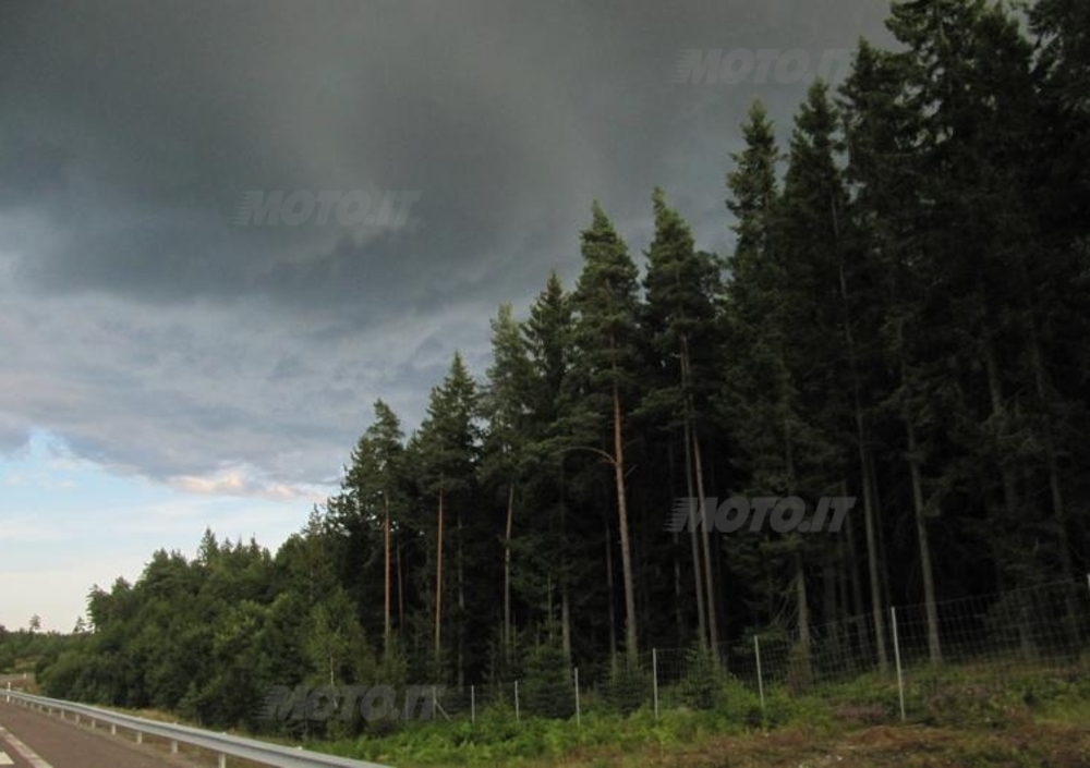 Il tempo non promette niente di buono. Fino ad oggi siamo stati più che fortunati ma temiamo di dover fare i conti con minacciosissime nubi temporalesche. Ci facciamo coraggio, in fondo siamo ben attrezzati. Il temporale arriva violento e ci coglie mentre siamo in viaggio; il cielo diventa improvvisamente tutto bianco ed una valanga di acqua ci cade addosso. Riesco appena a vedere la sagoma di un TIR che mi precede e lo seguo, è l’unico mio riferimento, inutile cercare le linee sulla carreggiata né il bordo della stessa. Dopo venti terribili minuti il temporale cessa rapidamente così come era arrivato. E’ andata benissimo!