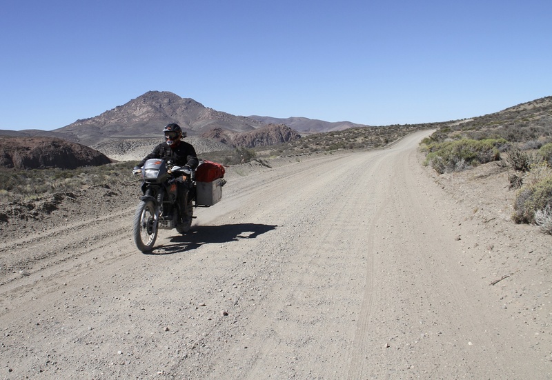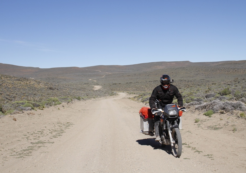 Finalmente il viaggio può veramente iniziare, mi dirigo verso Nord su di un’altra mitica strada Argentina la Rn 3, se vi dovesse capitare di esser da queste parti, vi prego non fatela, 3300 km da Buones Aires alla Terra del Fuoco, tutti dritti nella sconfinata Pampa, senza alberi né colline, hai dinanzi a te solo l’infinito, continui a guardare questa linea d’asfalto che si perde all’orizzonte e ti sembra che non possa aver fine, non si attraversano città, solo qualche sporadica stazione di servizio ogni 300/350 km ed almeno il terrone di restare a piedi ti tiene compagnia prima di ogni rifornimento. Ovviamente continua a piovere e ad esserci il fastidioso vento. Come potrei quindi in questa idilliaca situazione non forare il penumatico posteriore nel bel mezzo del nulla? Fortuna che gli Argentini sono un popolo fantastico e si prodigano per aiutare il prossimo, vengo perciò caricato su un grosso pick-up che mi porta da un gommista che mi ripara il tutto, ovviamente mi ero dimenticato di portare una nuova camera d’aria, avendo usato quella che avevo nel viaggio precedente. Dopo un giorno e mezzo di viaggio arrivo a Caletta Olivia, dove mi fermo ad osservare i maestosi leoni marini sulla spiaggia, torno alla moto e… sono a piedi, batteria morta, spingo riparto e cerco un posto per la notte, non dopo aver trovato e acquistato una nuova batteria.