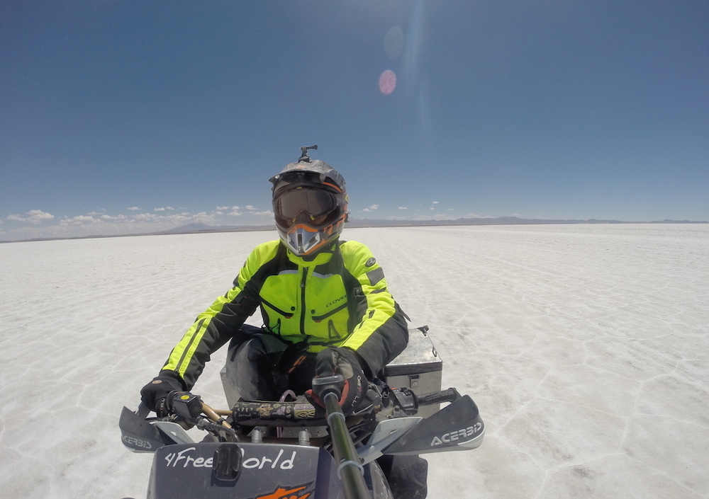 Sbrigo le pratiche per entrare in Bolivia, 40esimo paese visitato, di cui 26 in moto in 4 differenti continenti. Sono nel paradiso del motociclista, percorro 300 km, nemmeno uno d'asfalto, mi brillano gli occhi e il cuore è in pace con il mondo, sono felice e canto sotto il casco, arrivo nel pomeriggio dopo 550 km a Uyuni, piccolo villaggio vicino al noto Salare il più grande del mondo.