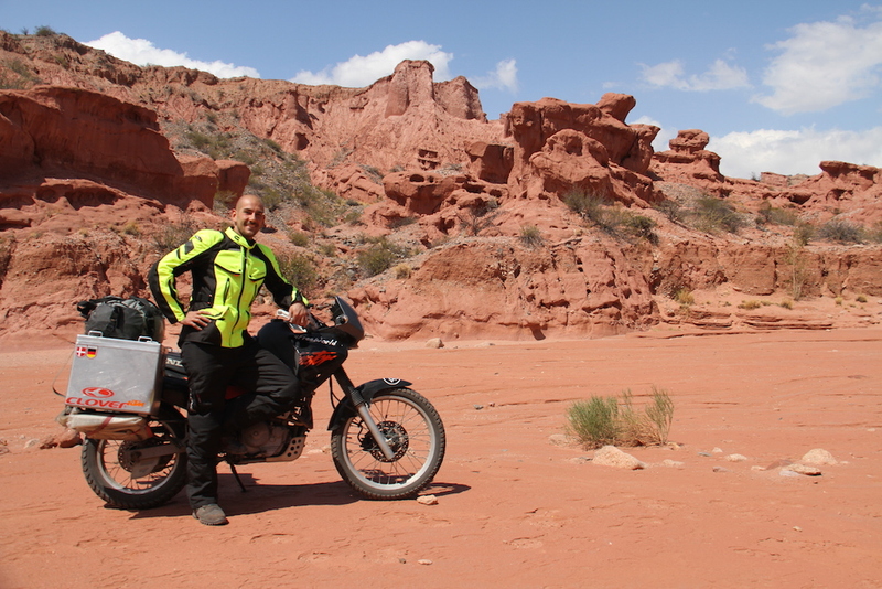 Detta così sembrerebbe che io non abbia fatto altro che guidare, ma a me sarebbe piaciuto prestarvi i miei occhi per farvi vedere questi stupendi paesaggi, darvi per un attimo il mio cuore per farvi sentire i battiti e l'emozione che si prova dinanzi alla grandezza della natura. Degli 820 km appena 150 erano di fuori strada, ma vi assicuro che sono stati tra i più belli mai percorsi. Già dopo pochi km, mi trovo dinanzi un paesaggio lunare con sabbia e rocce. Uscito da questo tratto mi dirigo verso Malargue, sulla strada vedo un lago salato, la Salina Diamante, scorgo al suo interno dei camion che lavorano e decido di entrarci per fare delle foto, fortunatamente memore di un errore simile fatto in Tanzania, mi accorgo che il terreno sotto la moto si sta spaccando e che c'è acqua, riesco a tornare indietro senza particolari problemi, cosa che non accadde in Africa dove dovetti tribolare più di 1 ora prima di riuscire a tirar fuori la moto.