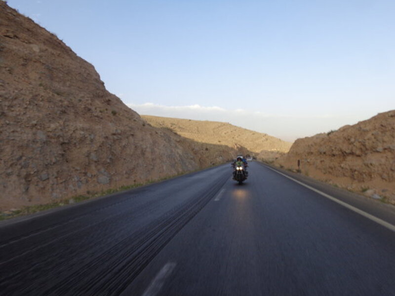 La mattina di buon'ora ripartiamo sotto la guida di Reza che ci accompagna fino a prendere la strada per Qom. Le strade in Iran sono di prima qualità e il traffico non è intenso, almeno fuori città. Prendiamo l'autostrada sebbene i cartelli indichino che è vietato l'accesso alle moto poiché in Iran è vietata la vendita di moto superiori a 200 cc. Le autostrade sono a pedaggio ma i cassieri, ligi alla prescrizione che prevede il divieto di accesso alle moto, non ci fanno pagare, sorridono e ci lasciano passare. Neanche la polizia, sebbene incontrata più volte in autostrada, non ci ha mai fermati.