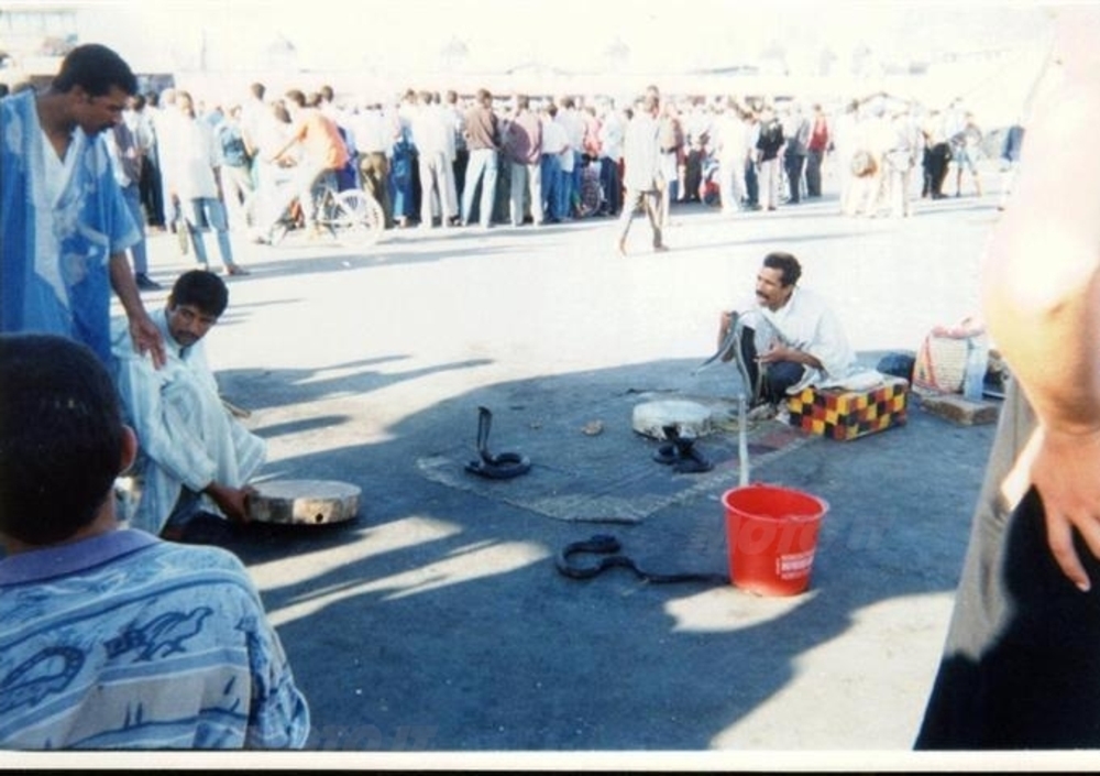 Ci si ritrova in un mondo fatto di saltimbanchi, artigiani, giocolieri, venditori d'acqua, dentisti da strada, incantatori di serpenti e gente che ti vogliono vendere di tutto portandoti quasi alla disperazione, (tanto sono assillanti) l'unico rifugio sono dei locali adiacenti alla piazza da dove dai loro terrazzi puoi tranquillamente immortalare l'intera baraonda.