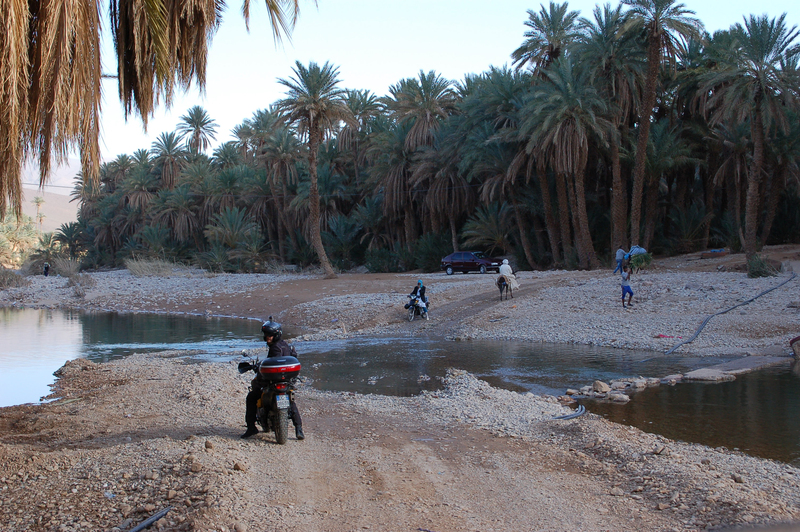 La meta finale della giornata odierna è Acca, in quanto nella nostra fida cartina (non amiamo viaggiare con navigatori o GPS o quant’altro, siamo legati alla vecchia moda), erano indicati sia un distributore che un hotel. Invece giunti a destinazione abbiamo constatato che non vi era proprio un’acca di niente!!! (passatemi la battuta). Decisi e sicuri che la mappa non sbaglia mai, ci siamo diretti nell’oasi vicino per scovare sto benedetto hotel, attraversando un villaggio con stradine strettissime ed effettuando anche un discreto guado visto che la via era tagliata da un bel corso d’acqua.