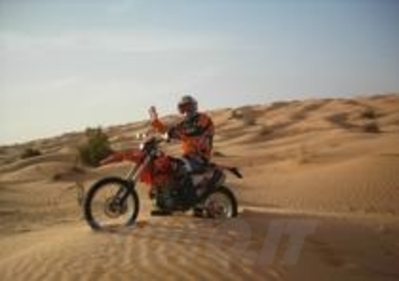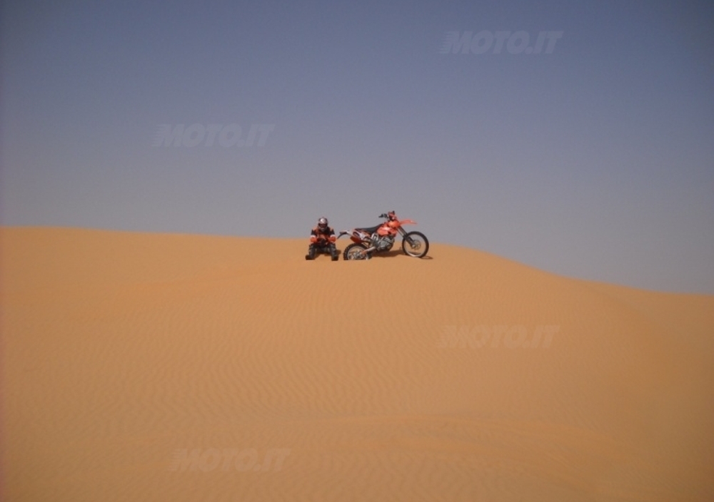 Ma ben presto la sensazione di dominio si ridimensiona dovendo fare i conti con le cime vertiginose di quelle dune così diverse da quelle del passaggio obbligato scelto dalla guida. Si perché, per chi non l’avesse capito, non era per niente necessario salire fin lassù… Volendo si poteva molto più agevolmente passare da un'altra parte. Era solo per il gusto di farlo! Ma è al momento di scendere che sembra riecheggiare il sorriso sornione del gigante che sembra rimproverarmi di aver cantato vittoria troppo presto. Da qualsiasi parte guardi, non vedo vie d’uscita alternative alla “picchiata” che sarò costretto ad intraprendere per tornare giù. L’alternativa di scendere in diagonale non appare preferibile in quel terreno così malfermo e rischia di peggiorare le cose oltre che prolungare l’angoscia. Bisogna solo prendere coraggio, tirare fuori la grinta e avere fiducia nella propria tecnica, nella forza degli avambracci, nell’assetto della moto, portare il fondoschiena indietro e non fare la cosa che l’istinto di sopravvivenza in quel momento mi imporrebbe: frenare!! La discesa sembra interminabile e sono attimi di vera p-a-u-r-a! Quasi a compensare la splendida emozione dell’ascesa. Ma arrivato giù la paura svanisce immediatamente, lasciando quel gusto di aver compiuto un’impresa solo apparentemente contro una massa di sabbia, ma in realtà la si è compiuta contro le più ancestrali paure che albergano nel nostro inconscio, dandomi l’illusione di essere riuscito a sconfiggerle.