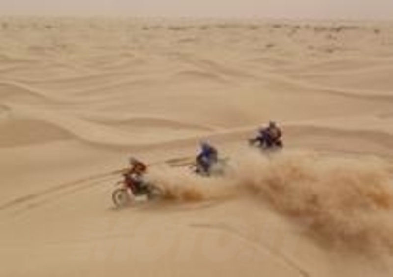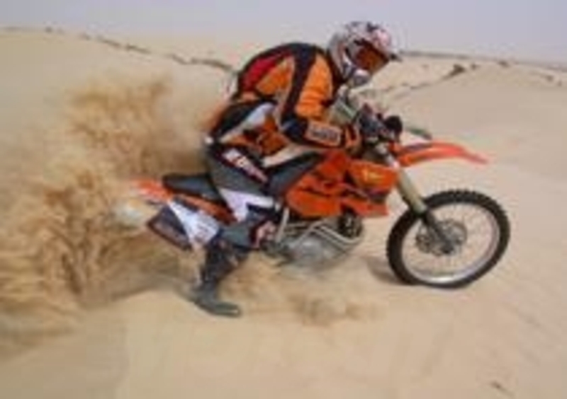 Questo momento merita un approfondimento sia tecnico che interiore: infatti l’euforia deve conciliarsi innanzitutto con la scelta ponderata del punto d’attacco, perché da quello dipenderà la riuscita della scalata. Basta sbagliare questa scelta per fermarsi a metà nonostante la potenza della moto, i tasselli della ruota motrice, la marcia giusta e la posizione corretta in sella. Se ti fermi a metà, questo comporta un notevole imbarazzo perché ti obbliga a invertire la marcia per scendere partendo da una posizione instabile sul fianco ripido di una duna dove non si era previsto di fermarsi. In quel momento, la mente umana dell’endurista è sottoposta ad uno stress non indifferente, dovendo innanzitutto perdonarsi per aver posto volontariamente le condizioni per trovarsi in una situazione a dir poco sconveniente e contestualmente trovare in concreto e con rapidità una soluzione plausibile. Lo spirito di adattamento, del corpo, della mente e soprattutto della moto, mi consente di riguadagnare il terreno pianeggiante ai piedi del gigante di sabbia che, sembra sorridere per la sfrontatezza mostrata nel volerlo sfidare. Più stanco e scoraggiato da un lato, ma fiducioso di poter fare tesoro dell’esperienza appena fatta e soprattutto mosso da un’ingovernabile spirito competitivo di negazione della resa, opto con più attenzione per un punto d’attacco più conveniente e senza timore che accelerare troppo possa essere controproducente, stringo il manubrio tra le mani e mordo la sabbia con gli occhi e la mente e si, salgo, volo, sto per farcela, calibro un pelo di meno nel polso destro in vista dell’ignoto oltre la sommità, ma senza esagerare per non venire trattenuto e vai! Sì! Ce l’ho fatta! Ho raggiunto il vertice, sto sovrastando il gigante, l’ho conquistato e sottomesso! Da qui le vertigini vengo neutralizzate solo dall’adrenalina. Mi sento Sir Edmund Hillary quando ha conquistato la vetta dell’Everest, Robert Edwin Peary, il capo della spedizione che ha raggiunto per primo il polo nord, Charles Lindbergh, l’uomo che ha compiuto la prima trasvolata dell’Atlantico, anche se la mia Ktm non assomiglia proprio allo Spirit of Saint Louis…! Insomma, una soddisfazione emozionante e unica!